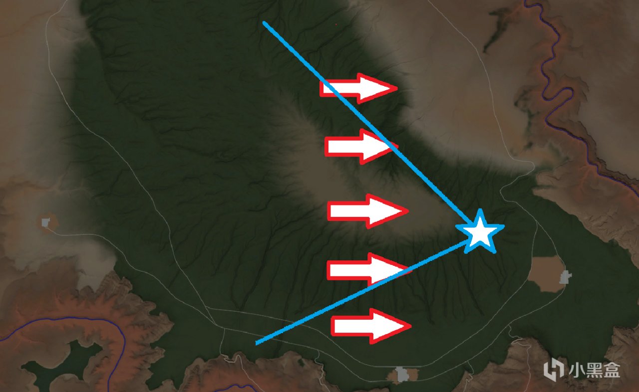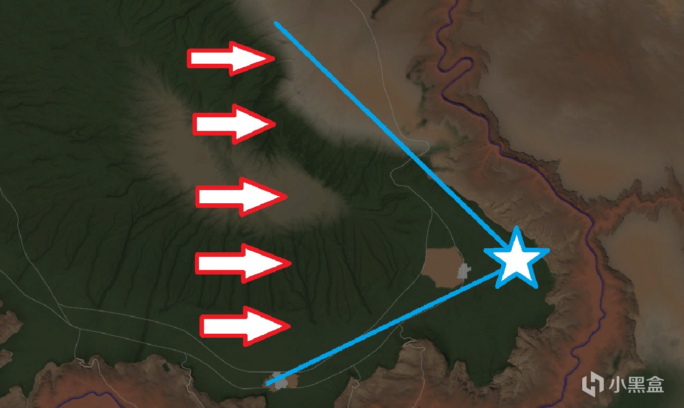 如圖,紅色箭頭爲敵方進攻機隊,藍色爲我的雷達掃描角度,藍色五角星爲我的位置,可以看到,由於裏敵人主力機隊過近,我的雷達很自然的無法掃到那些掃描角度外的敵人,而這些敵人正是那些會給我帶來致命一擊的傢伙
