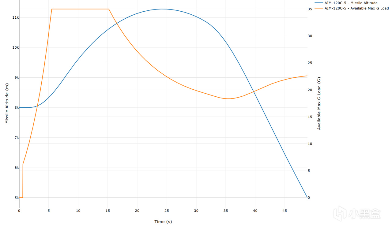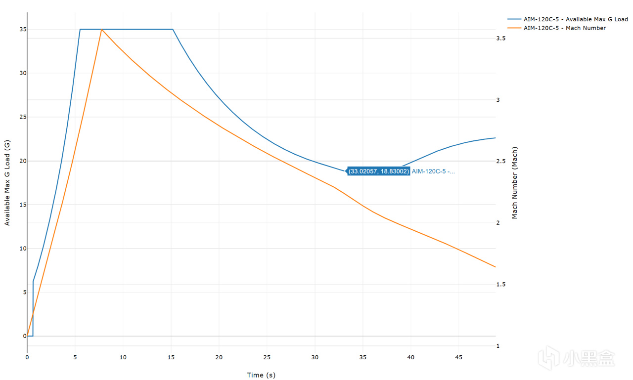 藍線爲可用導彈可用過載,橙線爲導彈馬赫數
