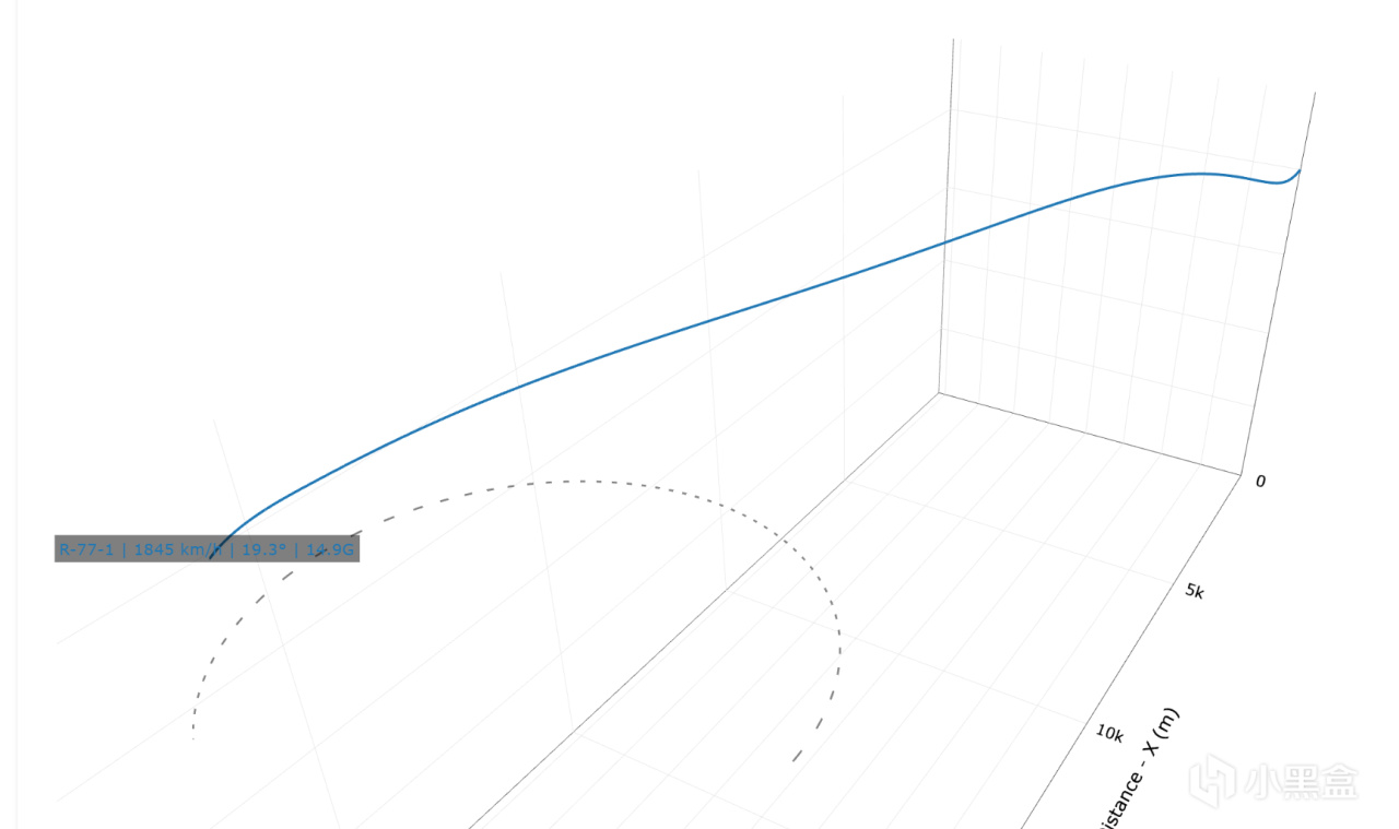 模擬高度8000m,R-77-1發射速度1500km/h,虛線爲目標運動軌跡,實線爲導彈運動軌跡