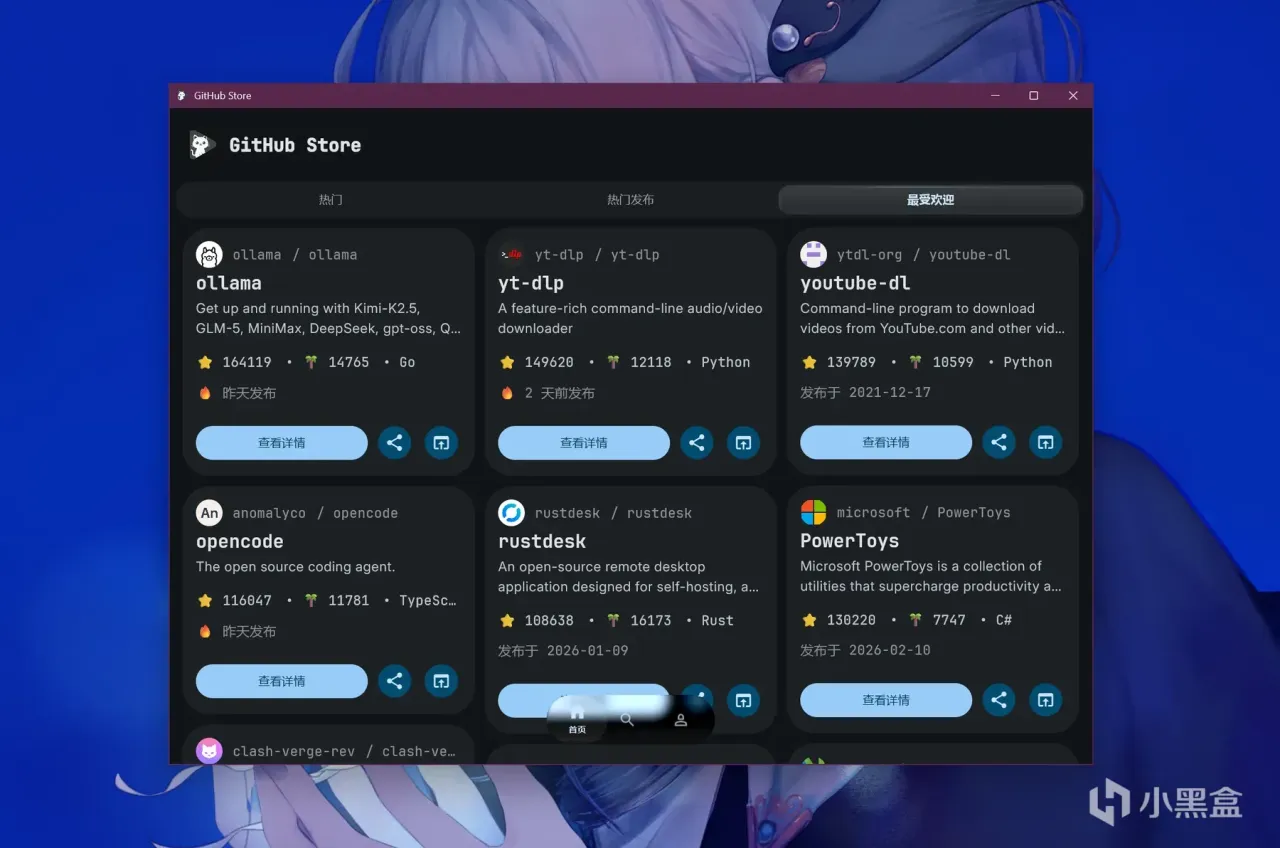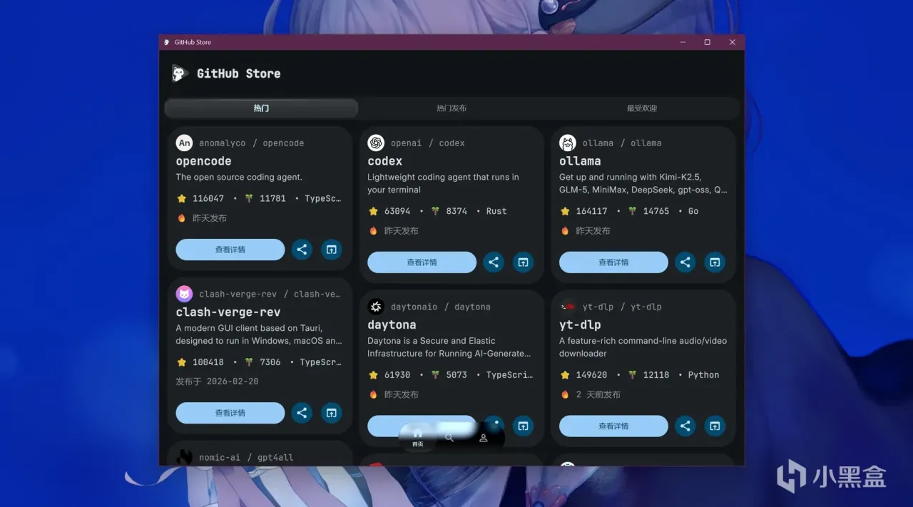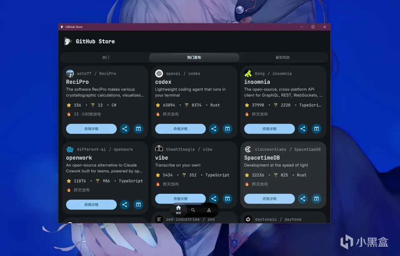 别看它功能强,用起来却超简单,完全不用复杂的操作,新手也能轻松上手。平时我们在GitHub找软件,要么翻半天找不到对应安装包,要么下错版本,而GitHub Store直接把「智能发现」拉满,首页分「Trending热门」「Hot Release最新发布」「Most Popular最受欢迎」三大板块,还带时间筛选,更重要的是,它只展示有可安装二进制文件的仓库,直接过滤掉纯源码项目,再也不用做无用功!