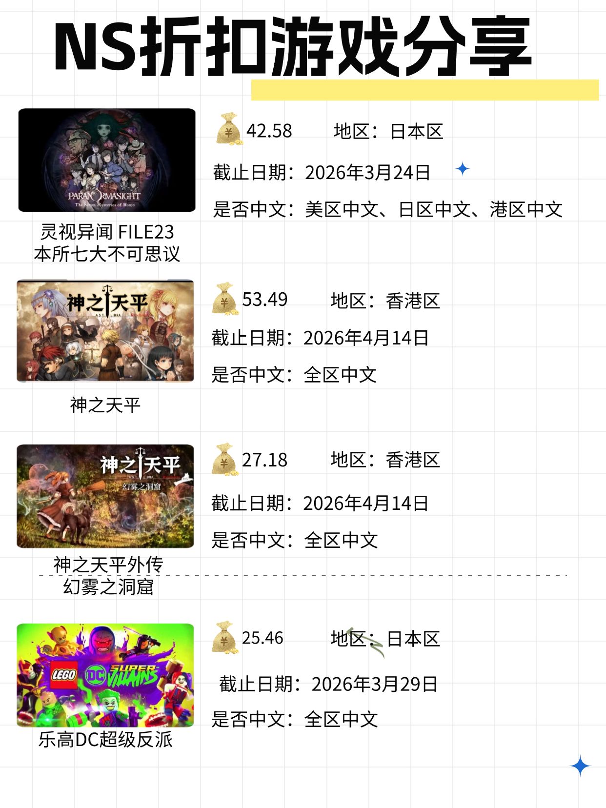 本週乙女系列不再列出啦,樂高系列在不同地區都有史低,不過入手之前要注意是否中文,神之天平可以無腦入,靈視異聞又迎來一次史低,有需要的玩家可以入手!