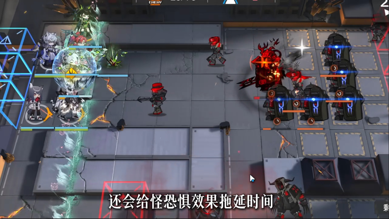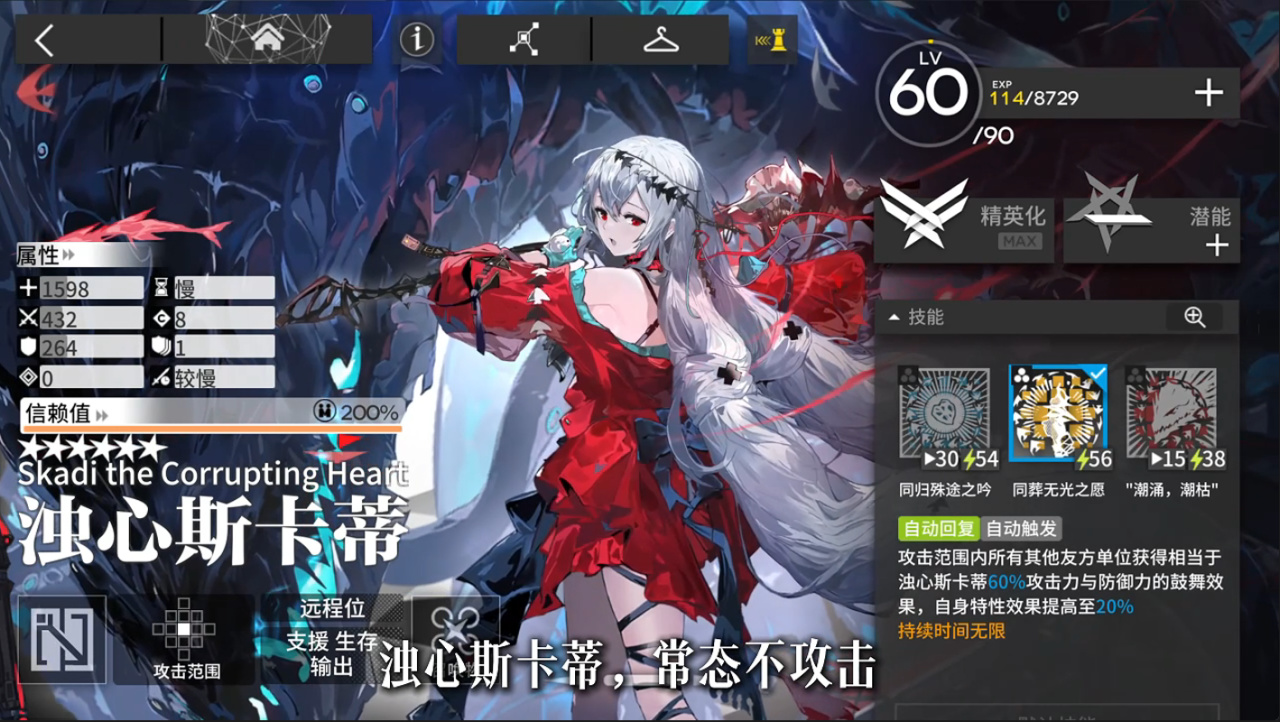 濁心斯卡蒂,常態不攻擊,爲範圍內隊友回血和加攻擊。