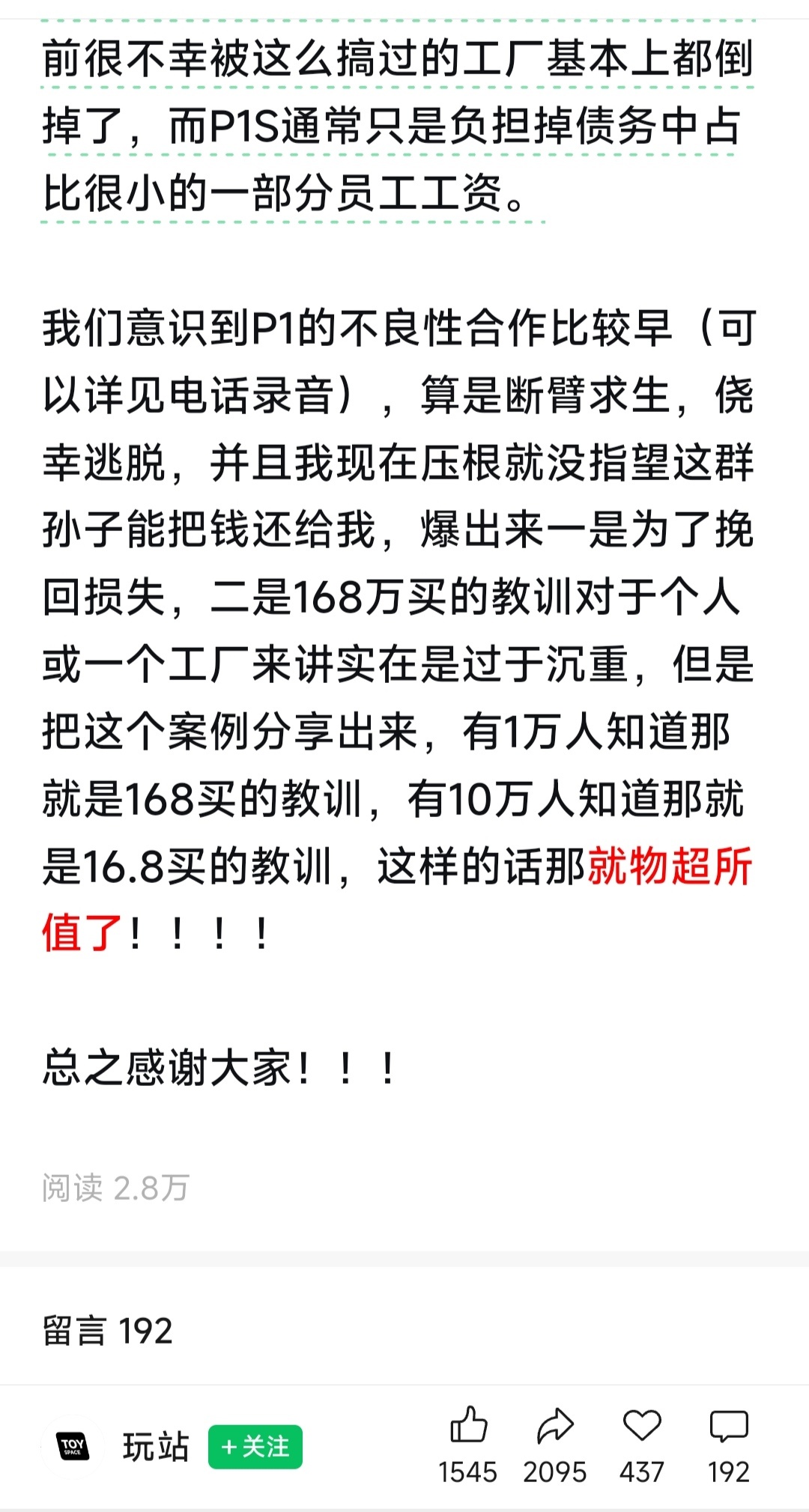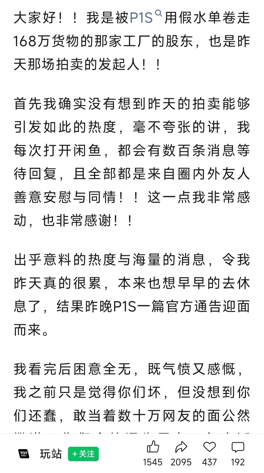 WX GZH【玩站】,被P1S 騙走168萬貨物的那家工廠股東已經於今日發文講述事件經過了。
