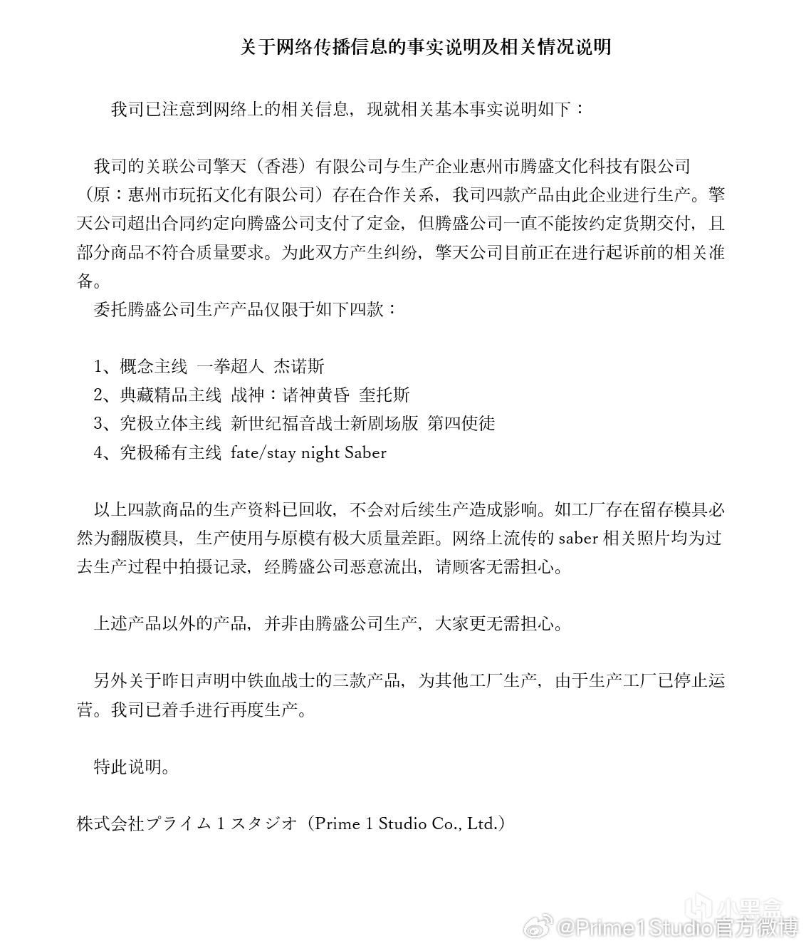 Prime1Studio官方在WB上發的最新通告
