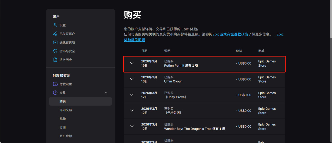 4.若不放心是否领取成功可以进入E宝账户的“交易”页查看:Epic购买记录页