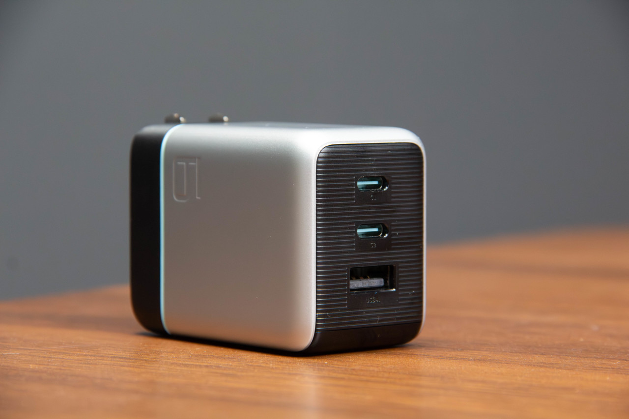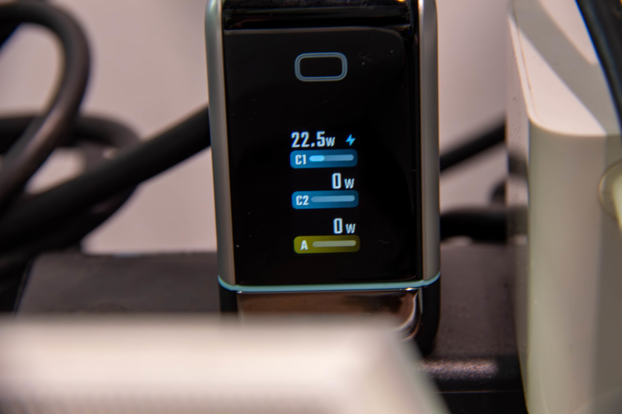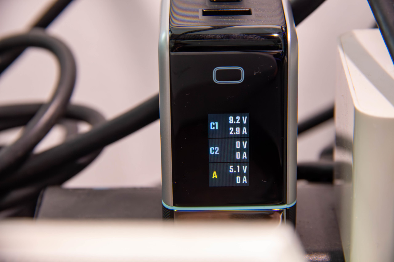 它有一块0.96英寸的屏幕,最高单口100瓦输出,接口是两个C口加一个A口,支持PPS、UFCS,还有品牌的私有协议。