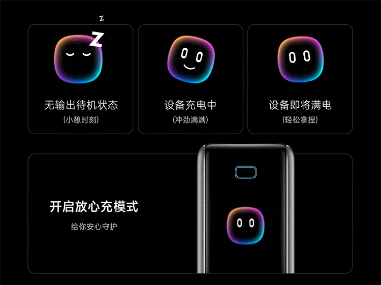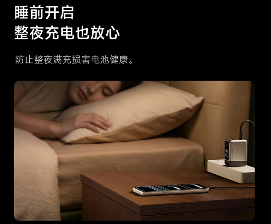 根据设备智能调控电压和电流。晚上睡觉开启放心充模式,它会充到95%就停止供电,防止手机长期处于满电状态损害电池。