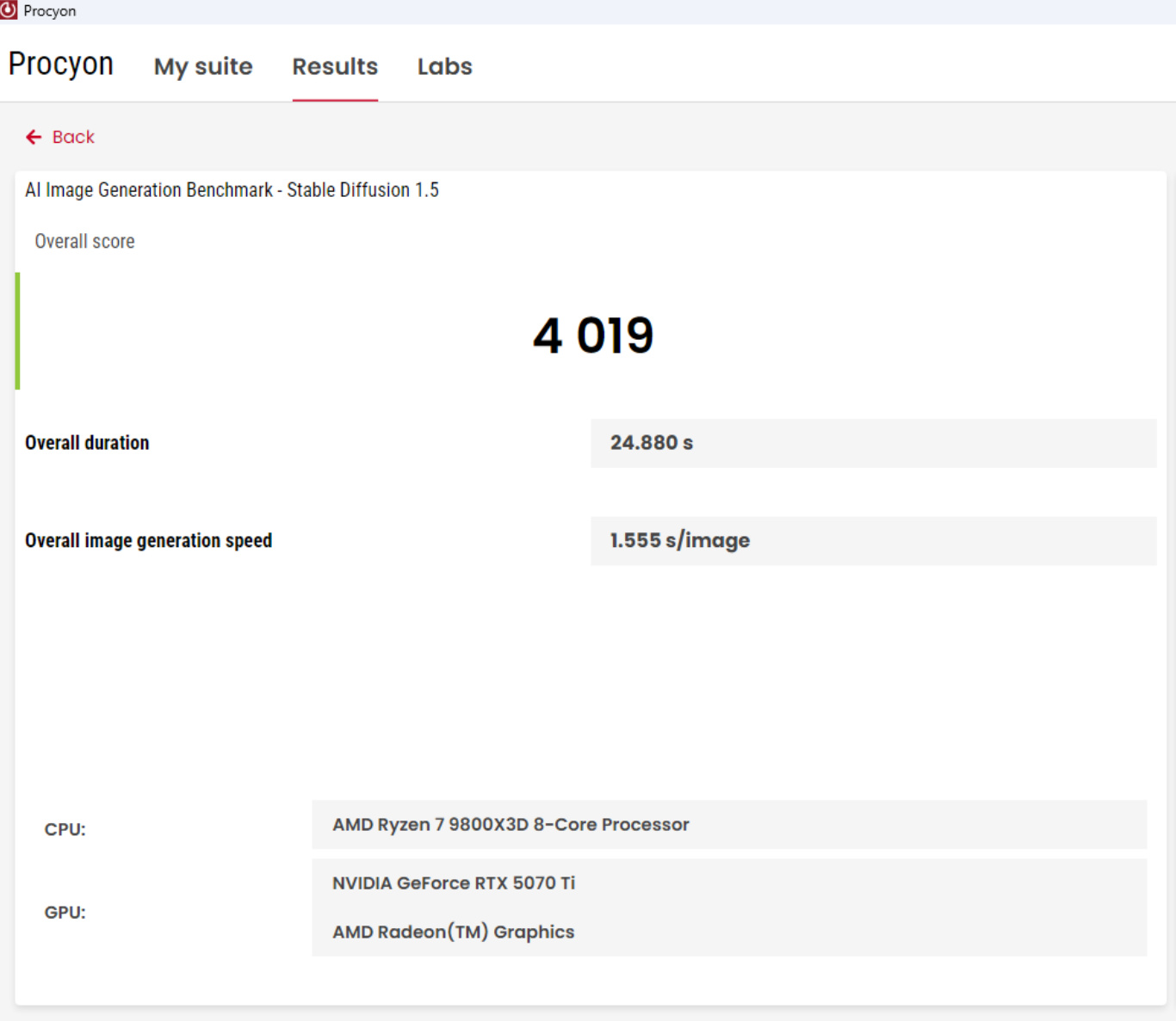 同時我們也用UL Procyon測試了Stable Diffusion 1.5的圖像生成,現在可以做到1.555s生成一張圖片。