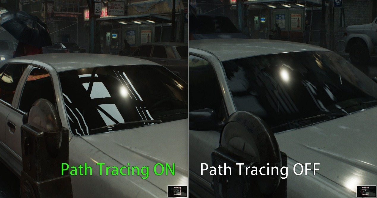 廢棄電話亭內的窗戶細節,在開啓路徑追蹤後讓人眼前一亮,街道對面的霓虹反射投影在了電話亭中。如果關閉路徑追蹤,這些細節也是沒有的。