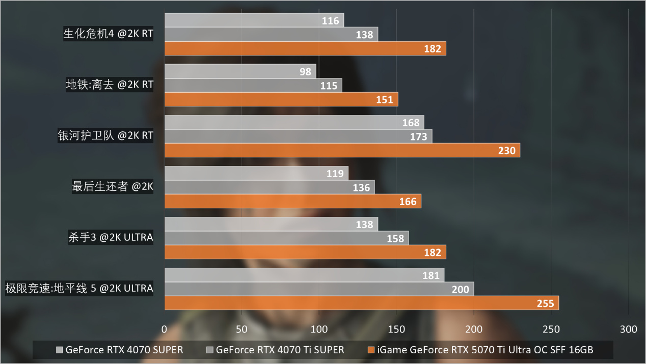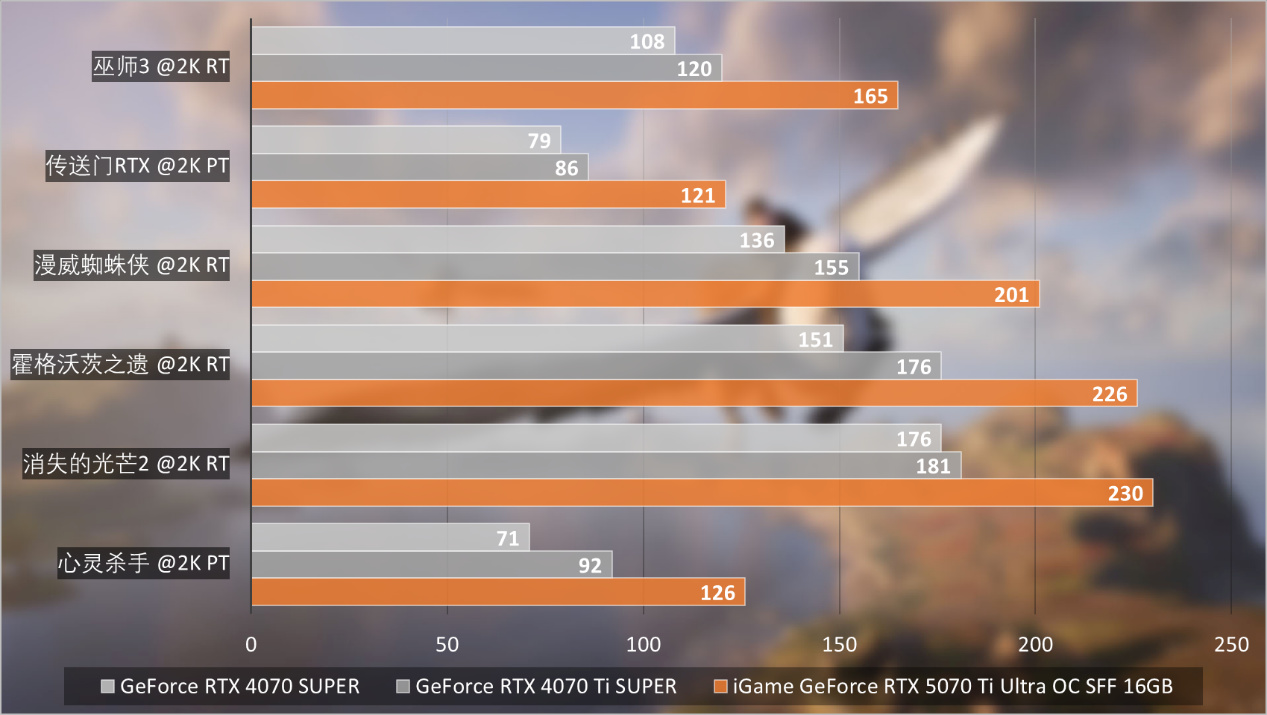 然後是2K分辨率最高畫質且開啓光線追蹤的遊戲測試。iGame GeForce RTX 5070 Ti Ultra OC SFF 16GB在開啓DLSS畫質模式,就能夠輕鬆相對RTX 4070 Ti SUPER提升30%到50%。