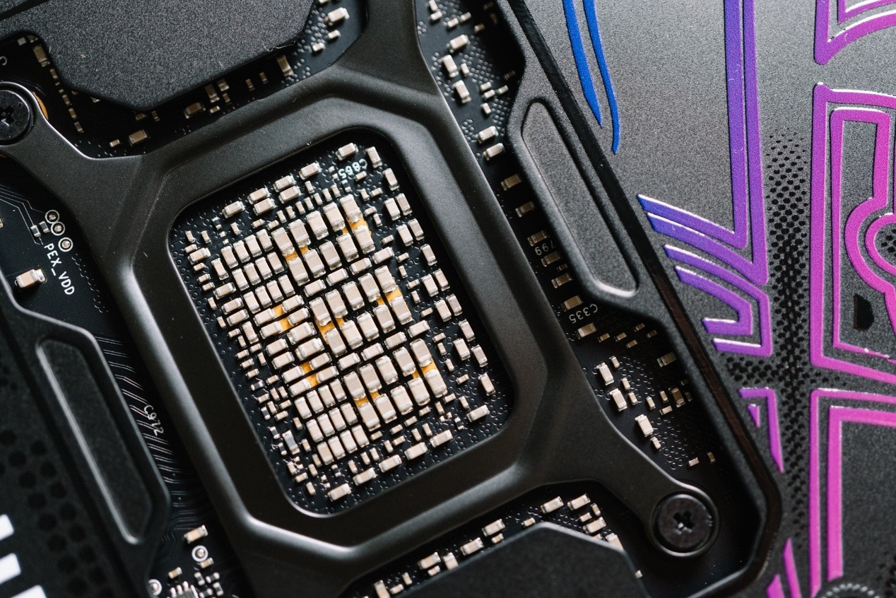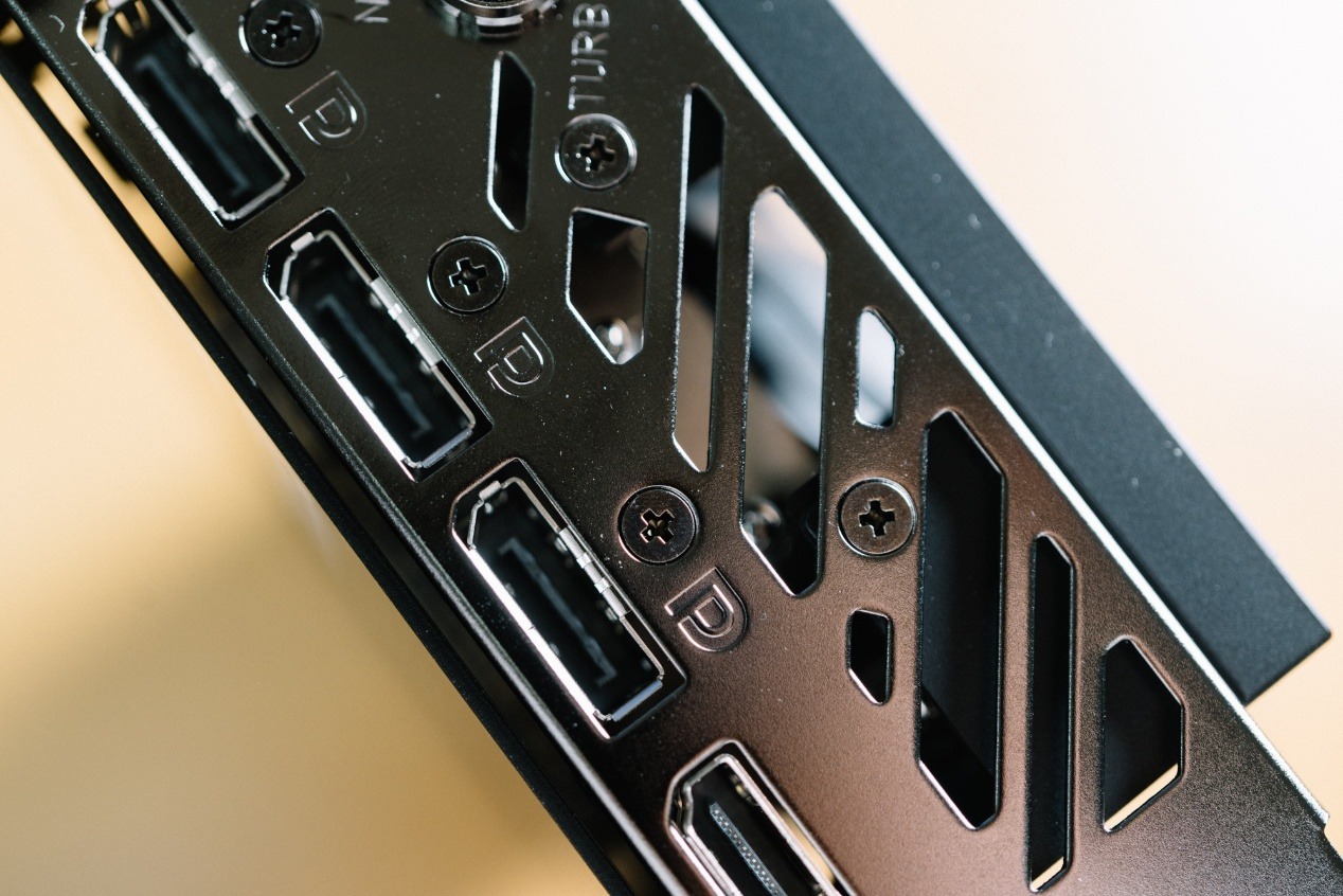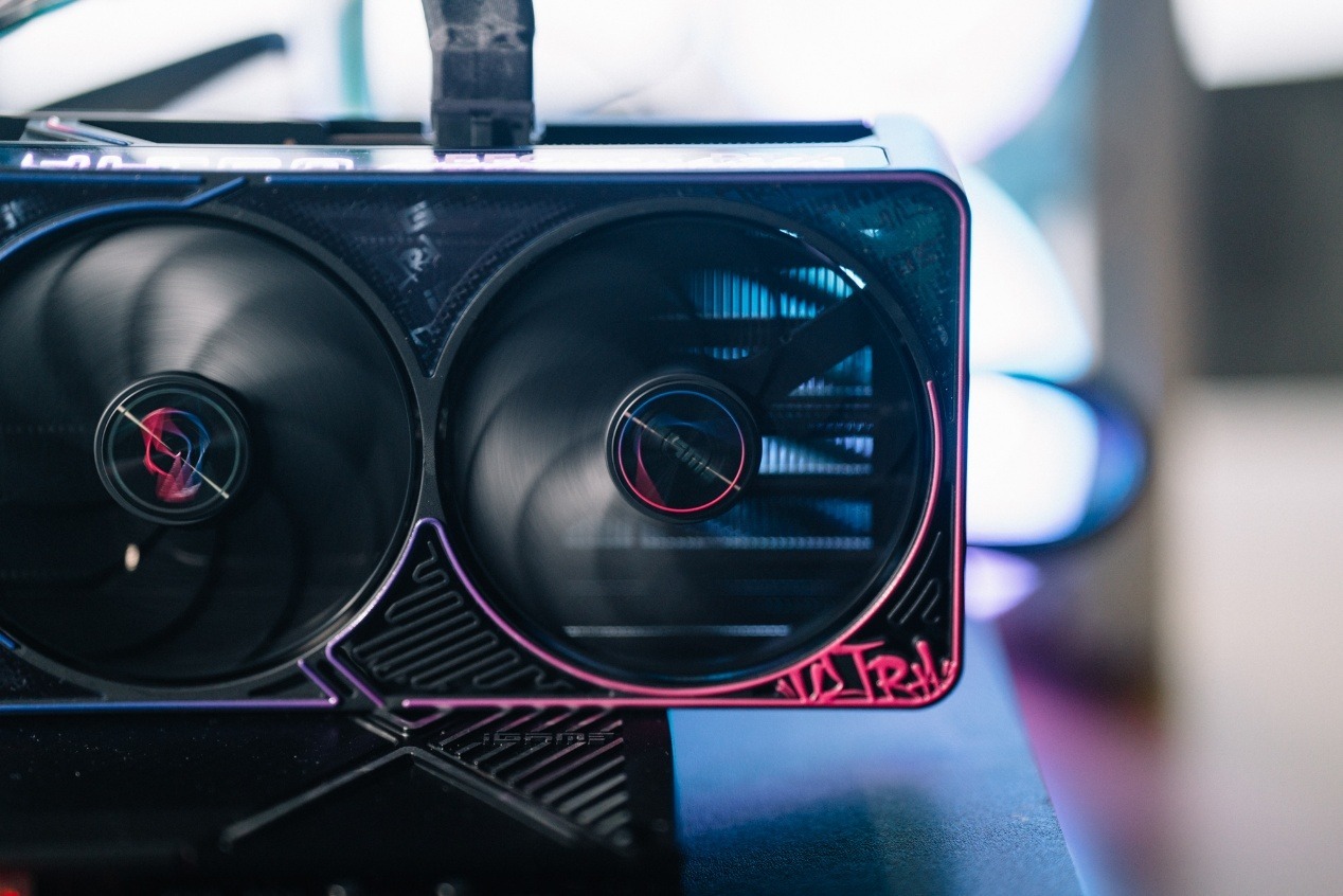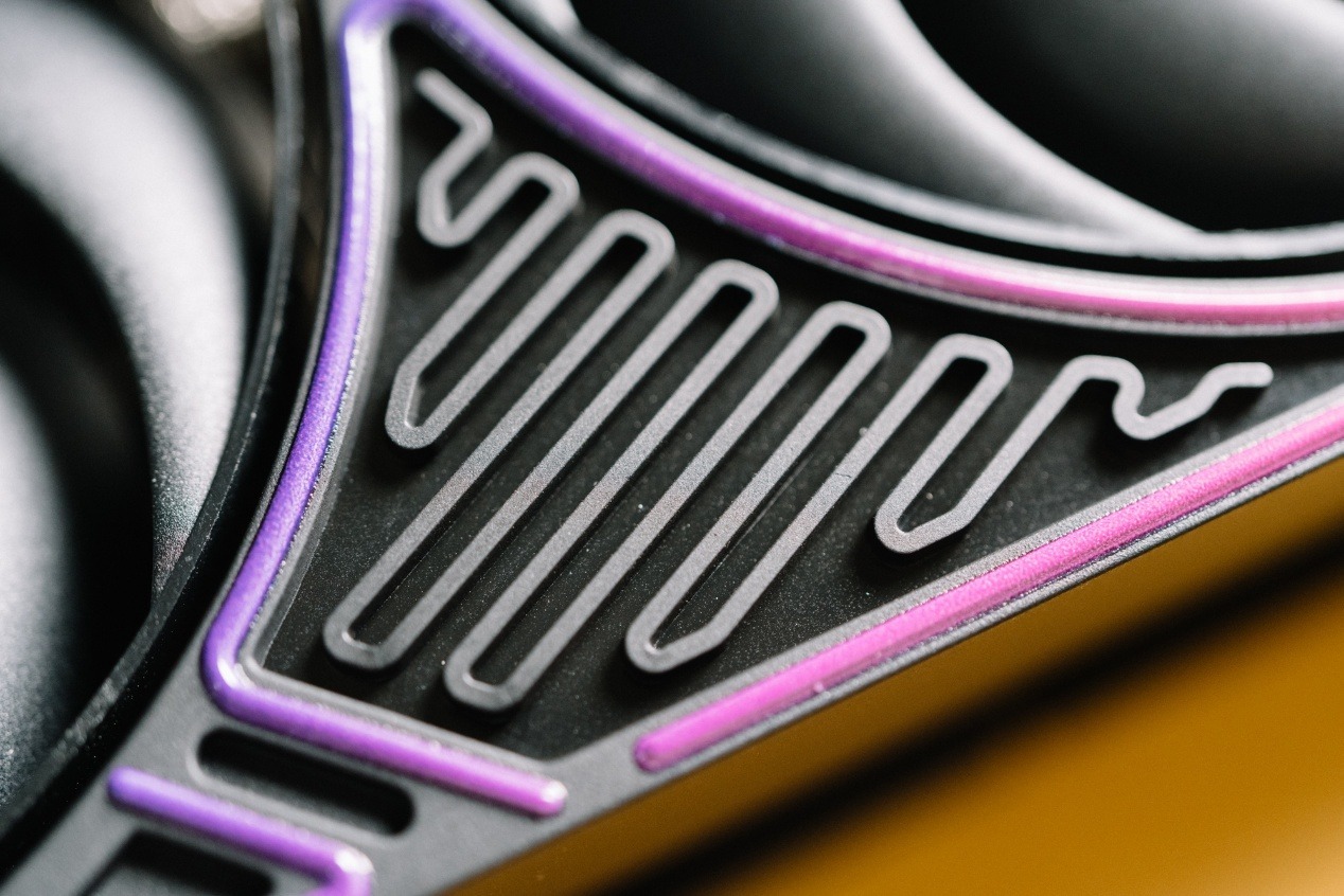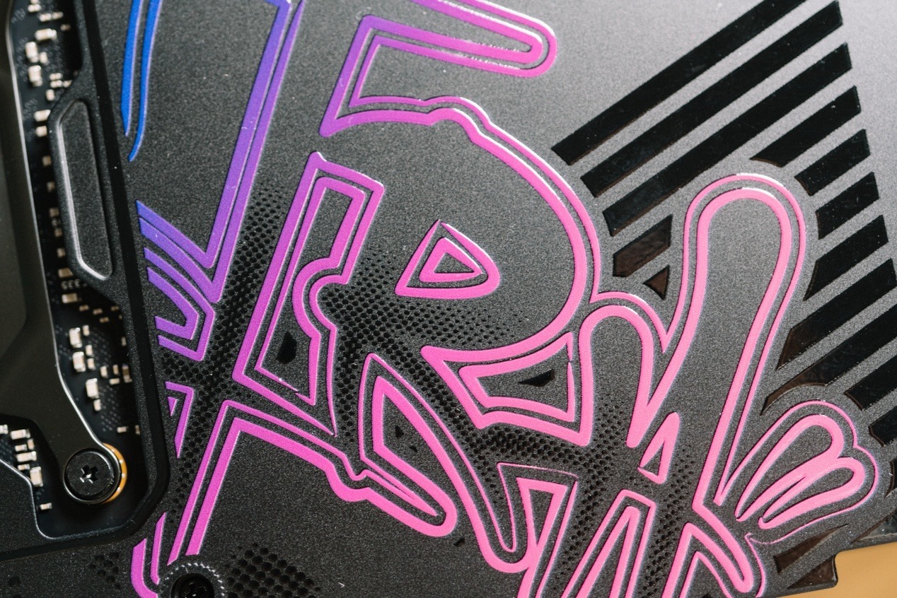 嘻哈律動的風格也進而延續到顯卡背板與側面,玫紅色漸變到紫色的設計風格很帶勁。塗鴉字體本身使用了立體印刷工藝,觸感有明顯凹凸感。同時背板使用了開孔設計,鏤空了GPU背面電容,可以看出用料十足。另一邊則是使用了通風道,配合PCB小板設計,允許氣流傳過鰭片,形成風道。