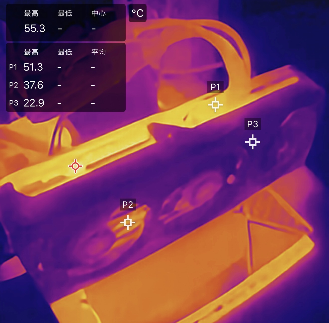 通過紅外線熱成像圖可以看到,顯卡表面最高溫度位於上方散熱鰭片接近GPU的位置,裝甲保持着清涼狀態,電源接口附近也處在合理的溫度。