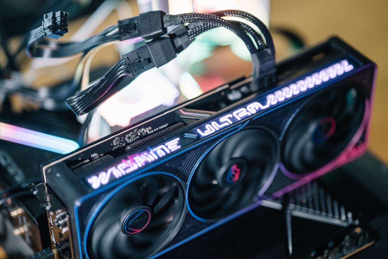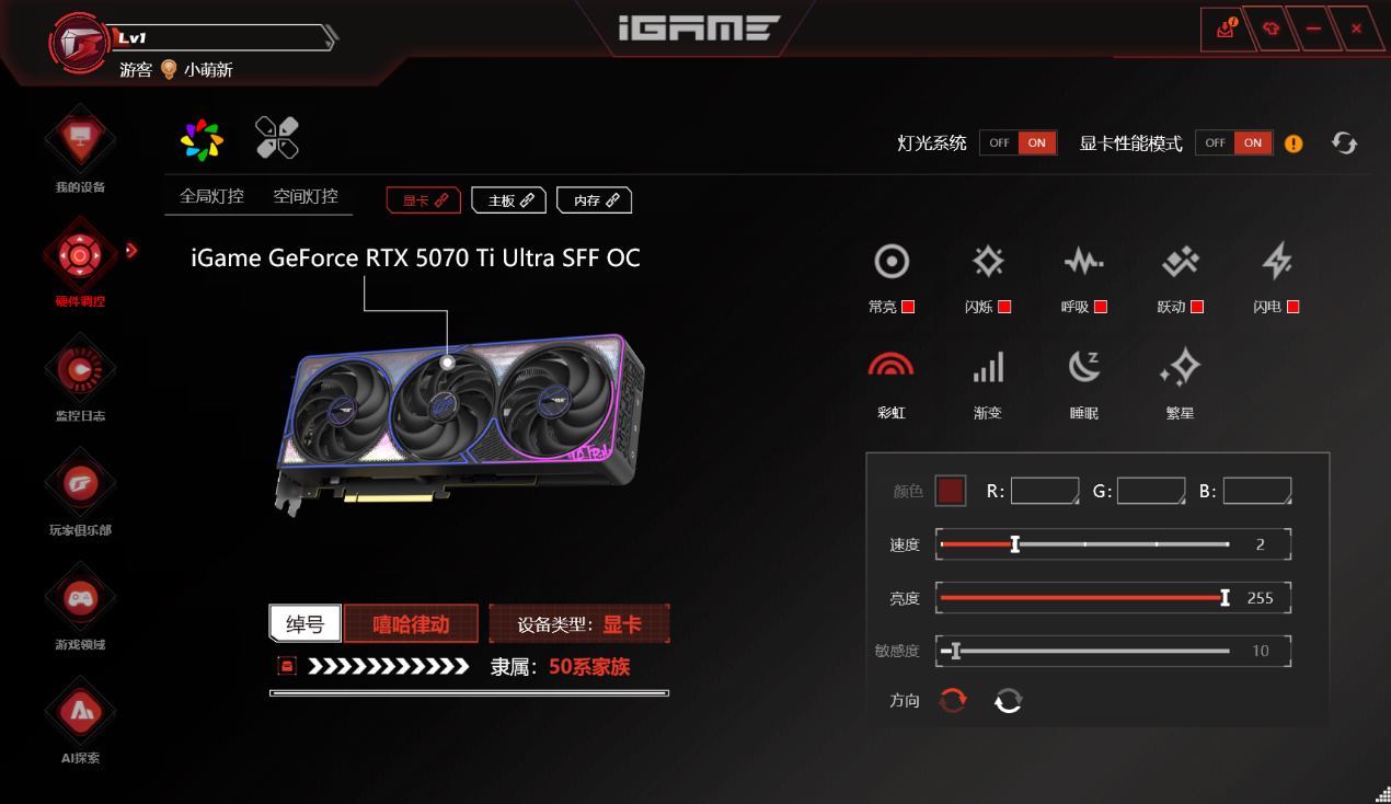 這條橫跨整張顯卡的塗鴉RGB光條可以由iGame自在星球控制,與iGame其他自家硬件一樣,直觀的控制呼吸、流動、音樂同步等模式,同時也可以配合主機其他RGB產生聯動。例如筆者在測試時使用iGame X870E VULCAN OC V14與其配合,最終控制內存iGame影DDR5-8000 24GB×2、風扇RGB聯動,確保裝機風格統一。