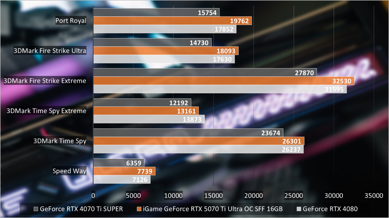 在檢測DirectX 11和DirectX 12性能的3DMark Time Spy,3DMark Time Spy Extreme,3DMark Fire Strike Extreme,3DMark Fire Strike Ultra,Port Royal的基礎光柵性能中,iGame GeForce RTX 5070 Ti Ultra OC SFF 16GB在同級別GeForce RTX 5070 Ti中表現出衆,甚至可以優於RTX 4080。