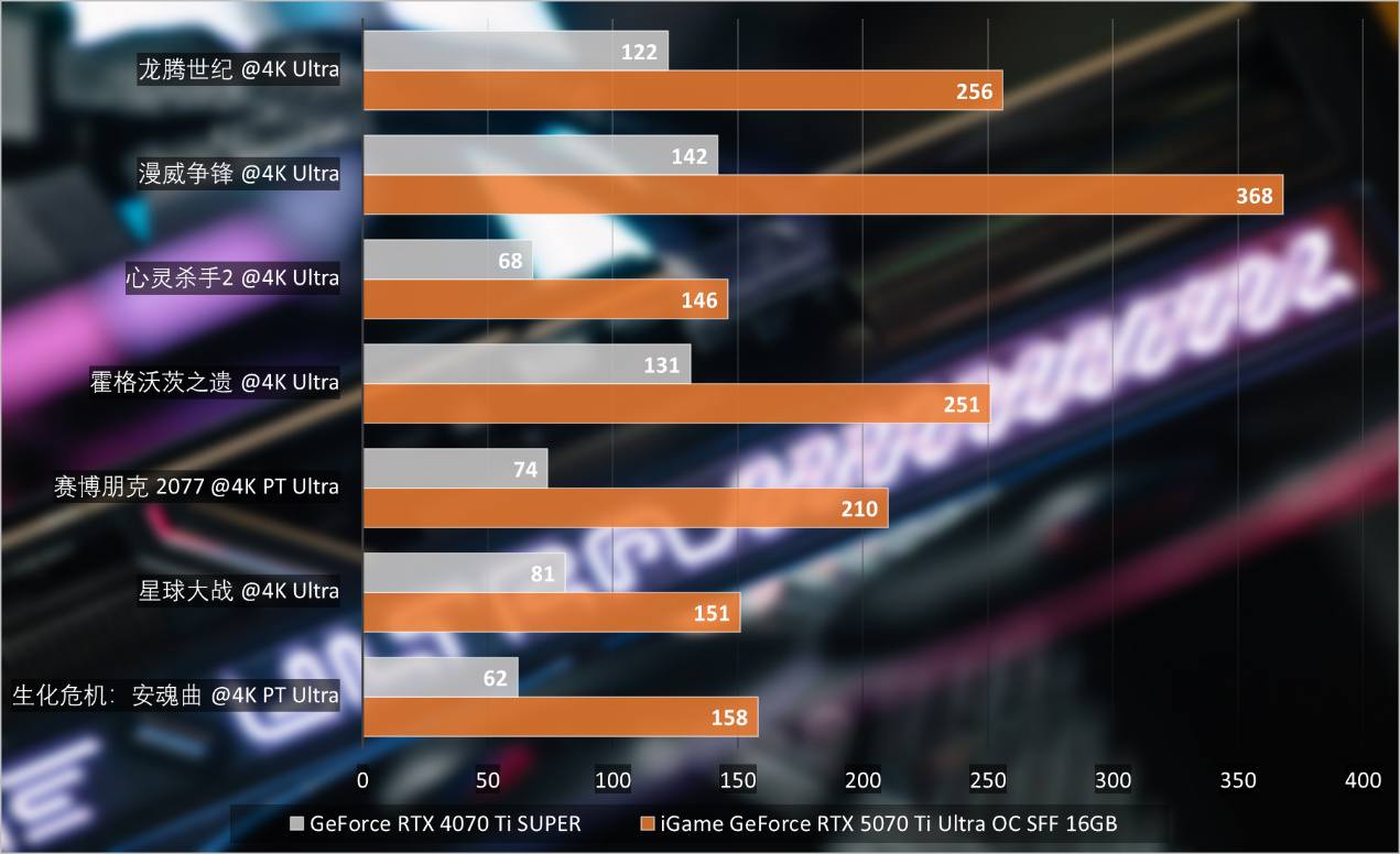特別遊戲能夠開啓DLSS 4 4x多幀生成,在4K分辨率最高畫質且開啓光線追蹤的前提下,則可以獲得RTX 4070 Ti SUPER超過2倍以上的性能提升。iGame GeForce RTX 5070 Ti Ultra OC SFF 16GB可以讓《生化危機:安魂曲》遊戲幀率鎖定在155FPS以上,喫滿一個高規格4K遊戲顯示器的性能。