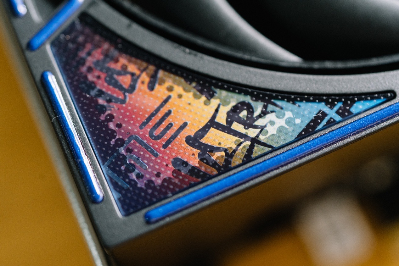 嘻哈律動HIP-HOP是一套獨特的藝術風格,靈感源自街頭文化的塗鴉(Graffiti)、混搭風格(Mix and Match)與自由不羈的態度。這使得iGame Ultra的RTX 50系列與RTX 40系列蒸汽波風格有很大的不同。它更強調視覺律動,嘻哈律動更強調視覺律動,通過規律起伏的彎曲線條模擬音樂節奏,同時也注重色彩碰撞,無論是此前白色系的粉白碰撞,還是眼前暗色系藍粉紫漸變光影配合玫紅撞色,都打造出了一套獨特的霓虹軌跡。