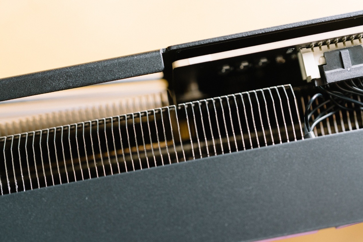 風扇下方使用了密集排布鋁製鰭片模組,很好的覆蓋了整個GPU核心、顯存以及供電模塊。鰭片之間由6×6mm熱管組成,並通過迴流焊工藝與鰭片完成連接,避免接觸缺陷。GPU接觸面部分,則使用了鍍鎳銅底拋光潔面與核心緊密貼合,進而提升散熱效率。
