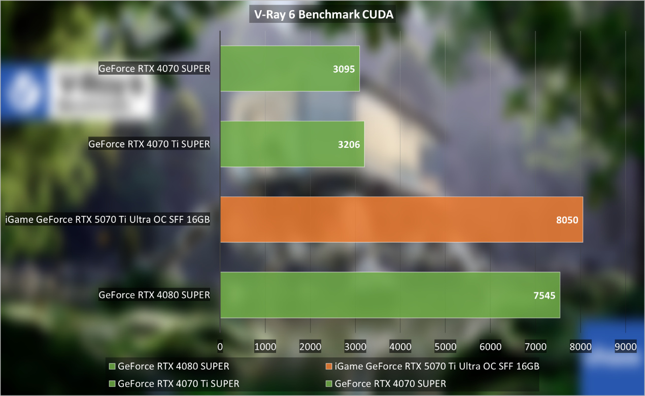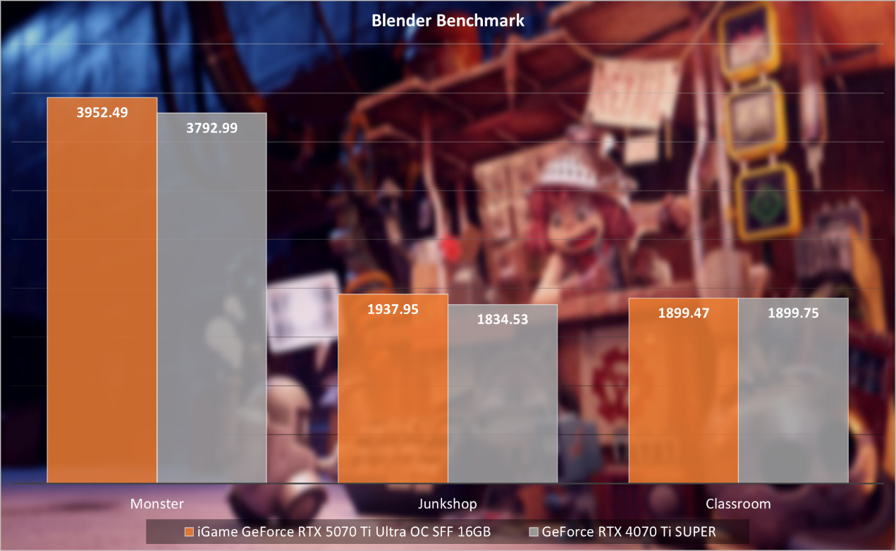 另一個則是V-Ray 6 Benchmark和Blender Benchmark,iGame GeForce RTX 5070 Ti Ultra OC SFF 16GB表現優於是GeForce RTX 4080,部分場景是RTX 4070 Ti SUPER的2.5倍。