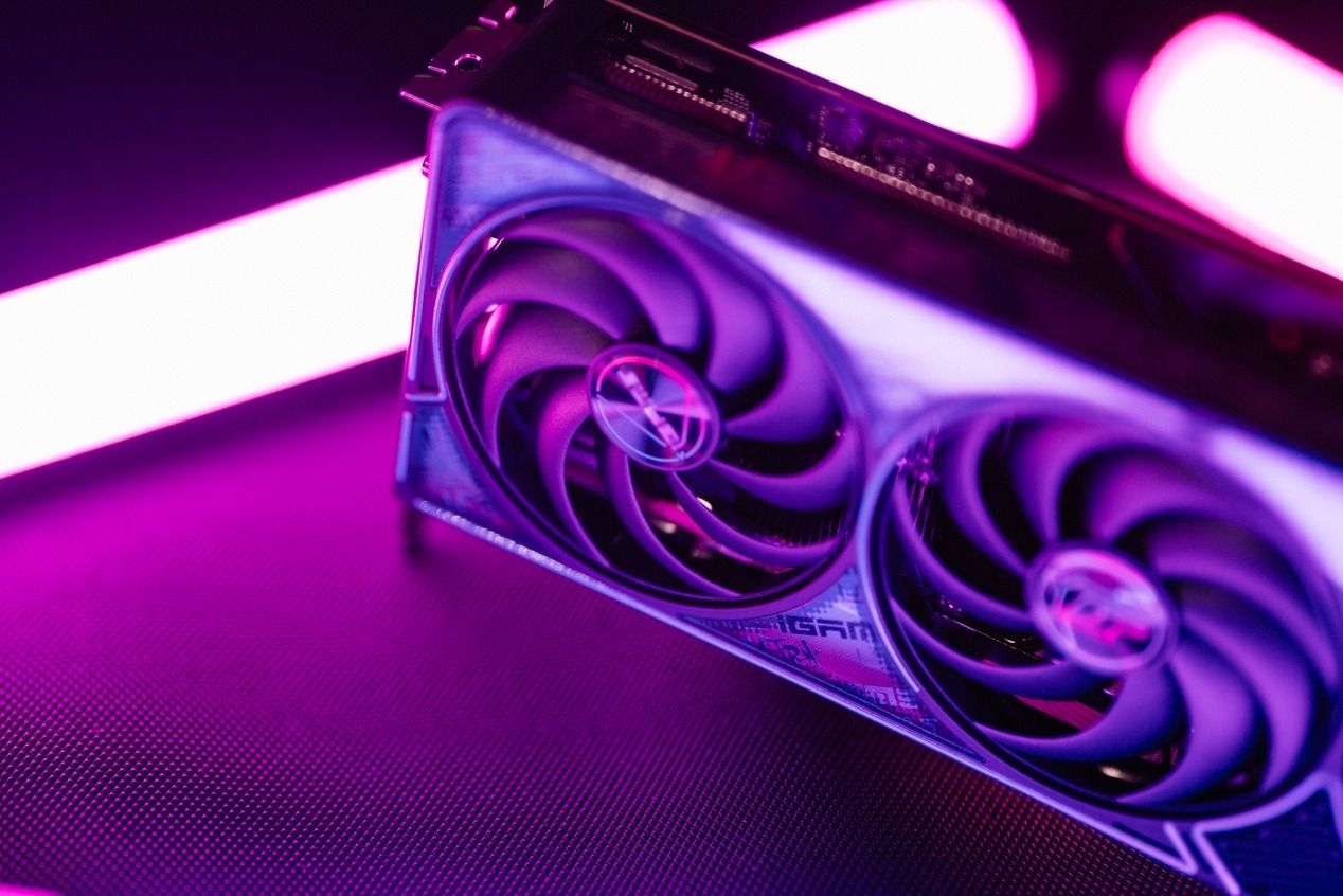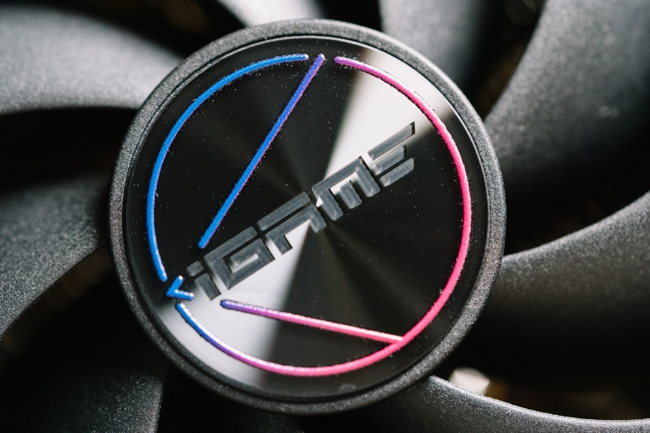 與此同時,黑色風扇搭配紫粉漸變中軸鐳射貼片,風扇邊框用藍粉霓虹線條勾勒,強調了顯卡本身的性能感。在正面裝甲邊緣,也慣例覆蓋了漸變透明組件,使用了紫色漸變效果,用來展現iGame標誌性圖騰紋理。