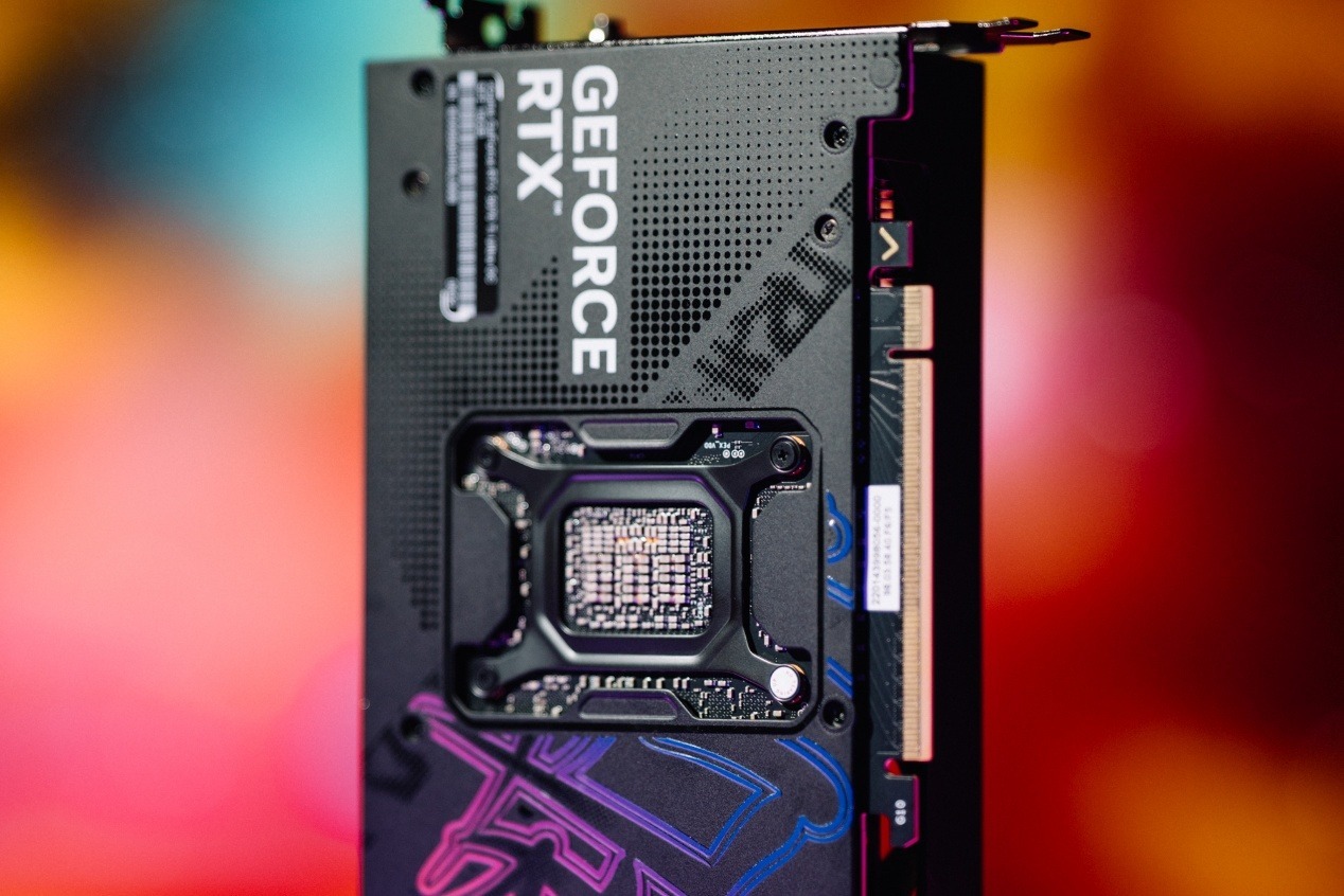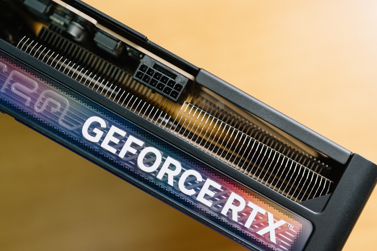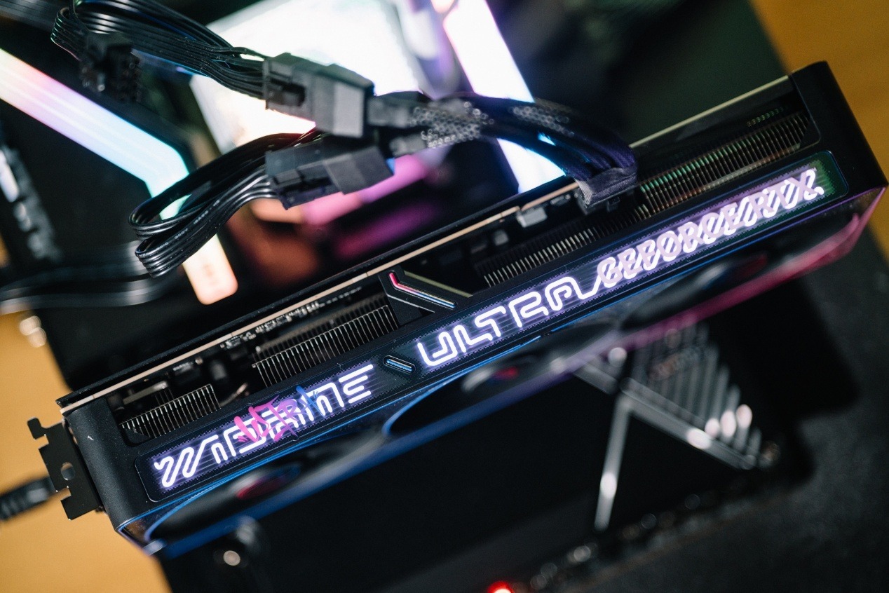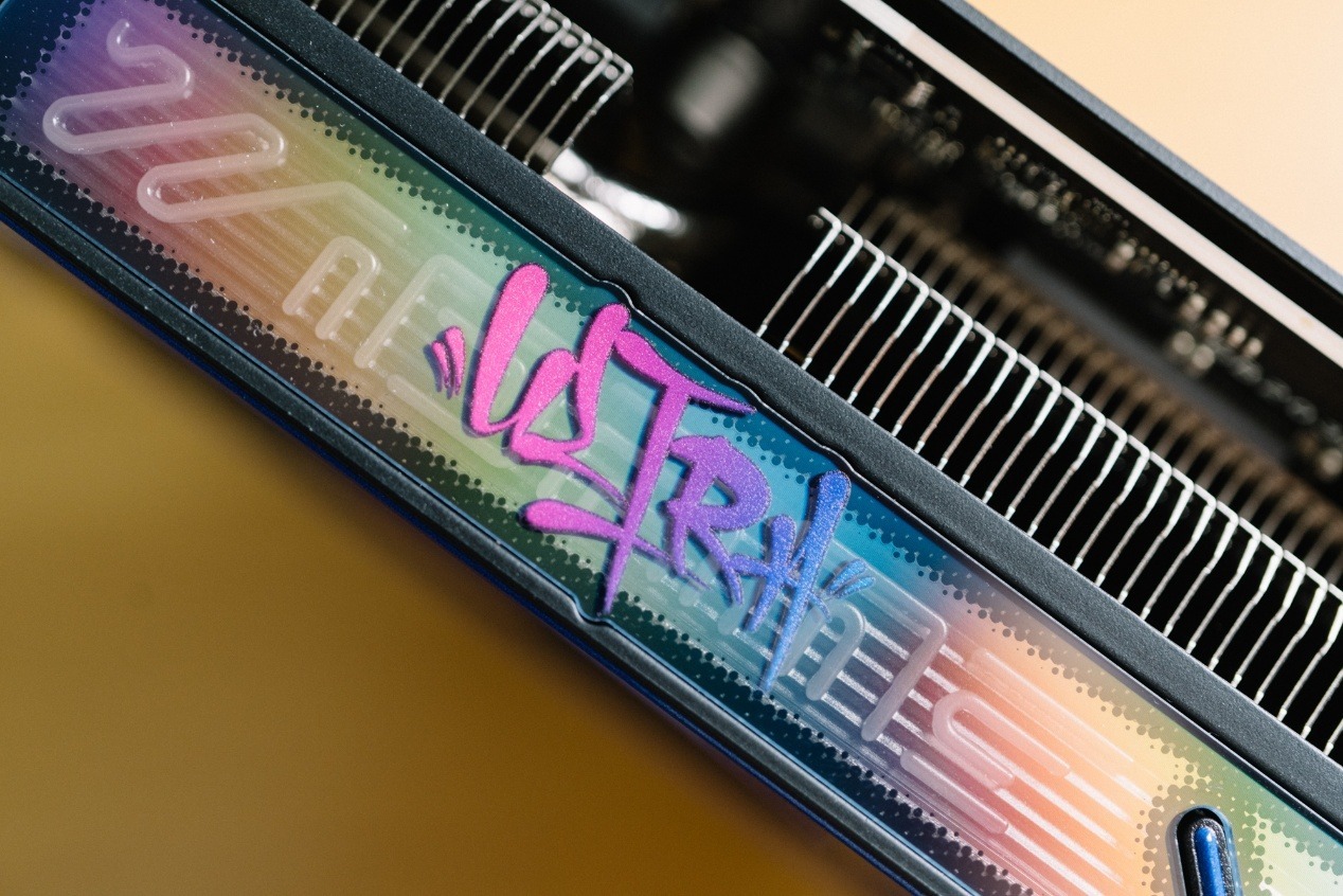 顯卡上方的塗鴉RGB光條橫跨了整張顯卡,也是iGame GeForce RTX 5070 Ti Ultra OC SFF 16GB的RGB光效定製的重要來源。在透明組件下套用了iGame Ultra的立體塗鴉。在默認狀態下,透明組件上方的GeForce RTX表明顯卡的身份,而一旦上機電量,背後的立體塗鴉霓虹燈強調了這是一張iGame Ultra顯卡。