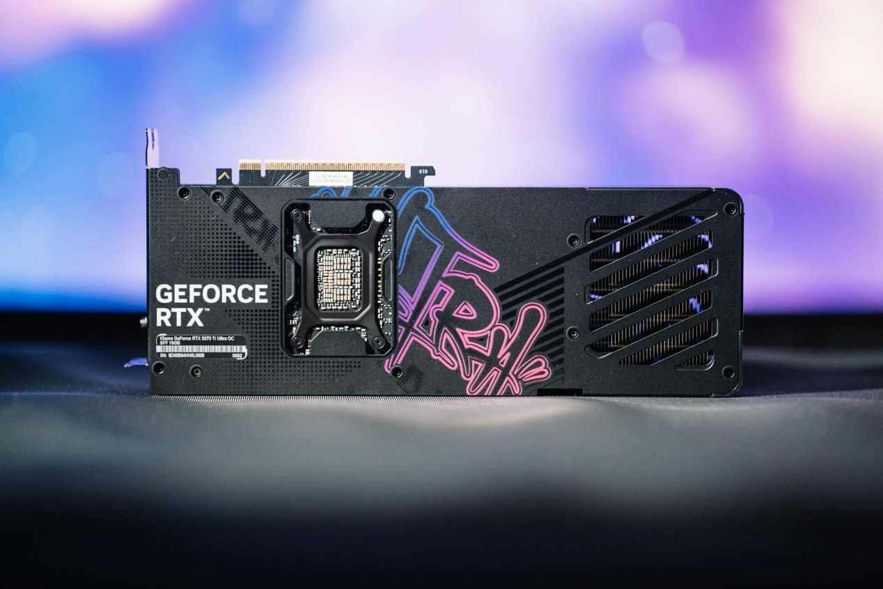 對於熟悉iGame Ultra的同學而言,眼前五彩斑斕的暗夜系主題足以讓人眼前一亮。原本白色系的iGame Ultra玩起黑色打底,HIP-HOP藝術風格加持下藍粉紫漸變光影頓時讓這塊顯卡生動了許多。那麼,時隔一年的GeForce RTX 5070 Ti應該具備什麼樣的素質?現在就由iGame GeForce RTX 5070 Ti Ultra OC SFF 16GB奉上。