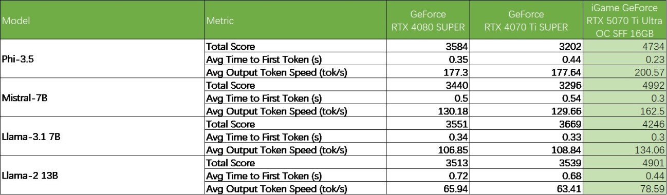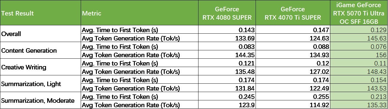 AI測試選用了MLPerf-Client v0.5作爲參考,這是一套MLCommons聯盟開發的機器學習基準測試MLPerf,MLCommons聯盟來自哈佛大學、斯坦福大學、NVIDIA、谷歌的工程師和研究人員。這裏MLPerf-client使用Meta的Llama2-7B模型進行。iGame GeForce RTX 5070 Ti Ultra OC SFF 16GB有明顯的提升。