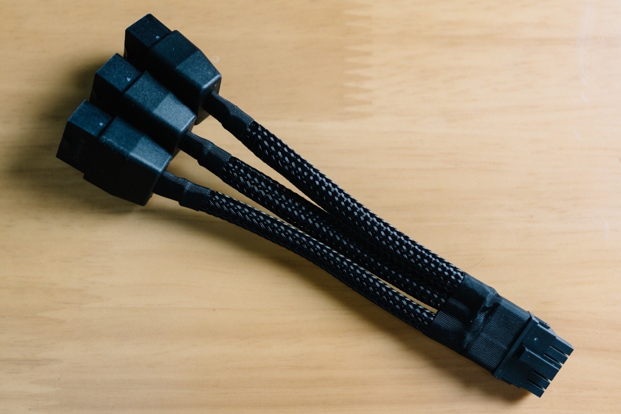 供電模組爲12VHPWR 16pin電源接口,10+4+3相供電,即10相GPU+4相GDDR7+3相輔助的設計,默認功耗300W,一件超頻功耗可以來到330W。顯卡也默認提供了16pin轉8pin x3電源線,以兼容舊規格電源。