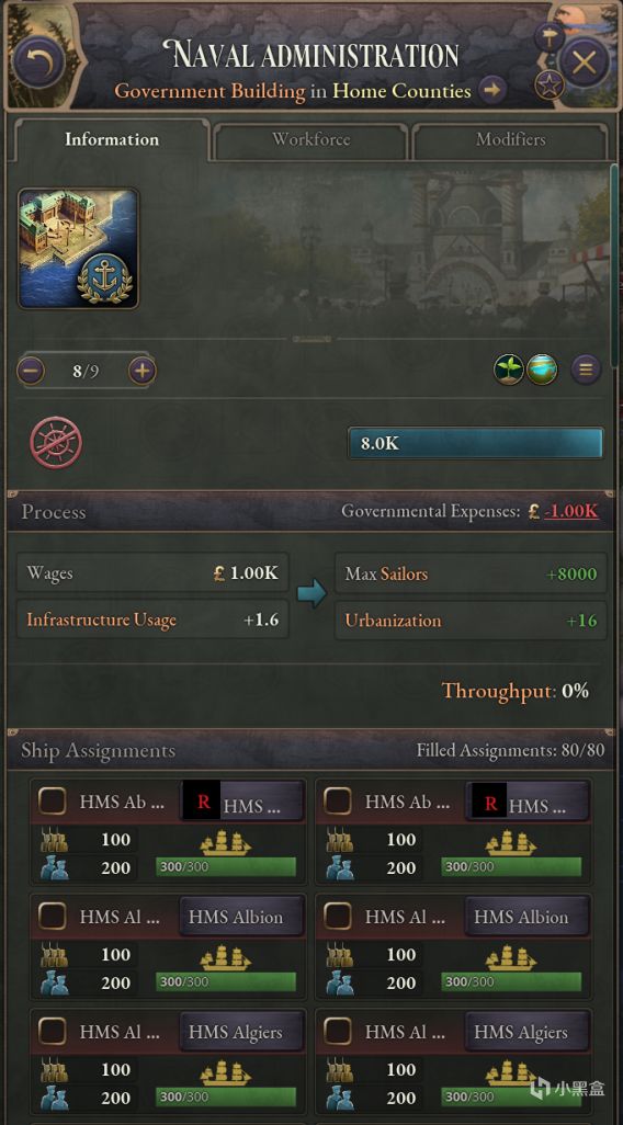 在建築頁籤中,你可以看到爲船艦提供海員的建築、建築的等級、服務的船艦數量與提供的海員人數。當然,每個建築“服務的船艦數量”之和有時會大於艦隊中的船艦數量,有時兩艘艦艇可以同時從兩個建築中得到海員。