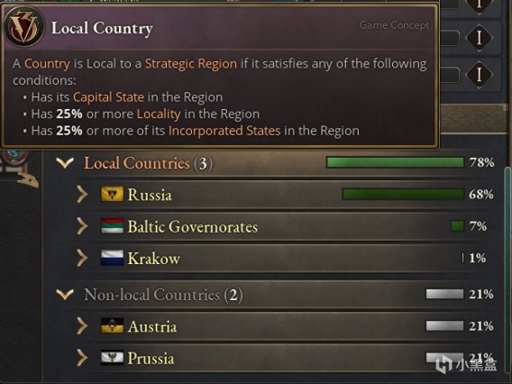 你可能注意到了本地國家這個概念。這是一個新的概念,描述國家在某一戰略區域內的狀態,分爲本地國家與非本地國家兩種。本地國家需要滿足以下條件: