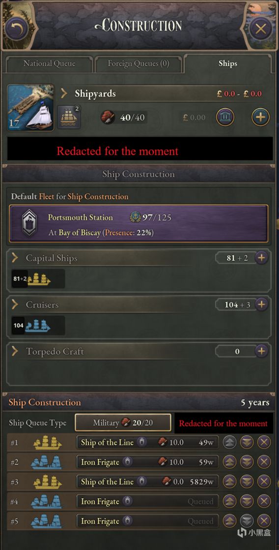 艦船建造過程需要不同的資源與材料,由艦船類型確定。這些資源與材料將成爲造船廠的投入品,被平均分配給每個造船廠。當然,此前的戰艦商品已成歷史。我們曾考慮過讓每個造船廠都擁有自己的隊列,不過這樣帶來的好處與我們需要付出的努力不成正比。