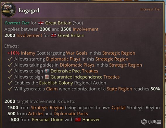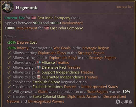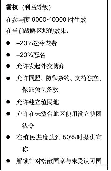 更高等級的利益將十分重要,可以解鎖外交行動、解鎖與本地國家的外交條款,也能解鎖一些全新能力,如創造“殖民宣稱(Colonial Claims)”——當你的殖民地增長至至少半個地區大小時,獲得一個宣稱。
