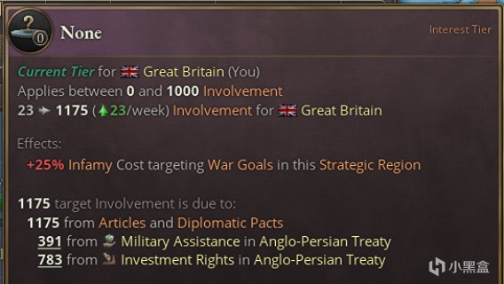 想要提高利益等級(Interest Level),你需要在對應的戰略區域內提高參與度(Involvement)。有不少方法可以做到這一點:與當地國家簽訂不同條約、擁有附屬國、指派艦隊去海岸邊展示力量(Project Power),或是——當然,顯而易見——直接來場征服。