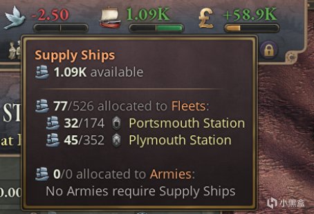 當然,艦隊的補給消耗也取決於其中的船艦。龐大的艦隊相比於小型艦隊消耗更多補給,根據補給的消耗情況,一定數量的補給船需要被分配給艦隊以補充補給。