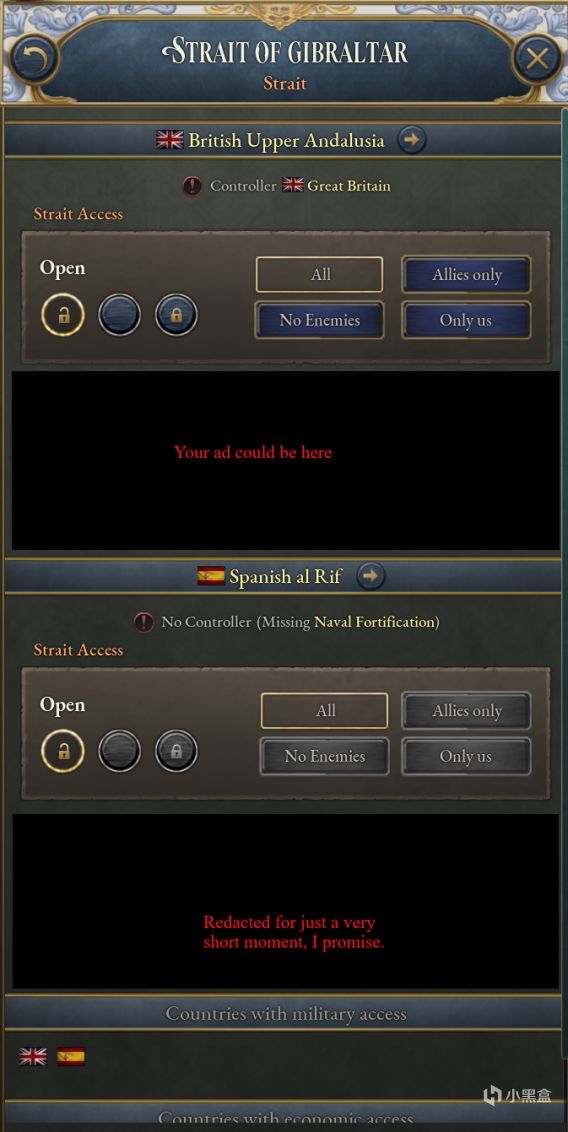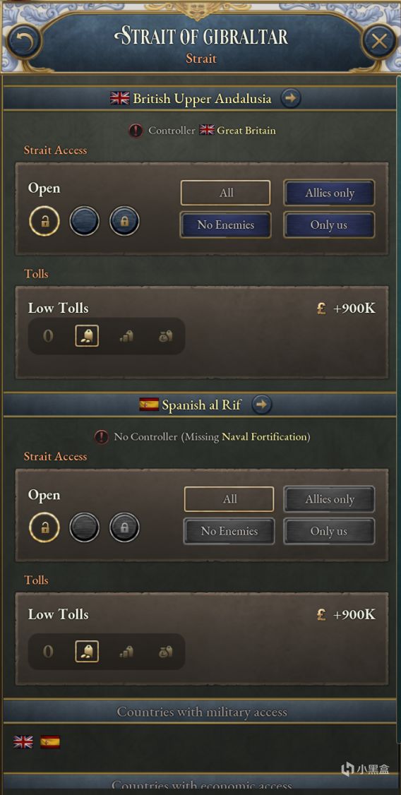 你可以設定允許誰通過海峽的准入級別,選項包括僅限自己、僅限盟友、僅限非敵人、所有人,可以分別爲民用與軍用船艦設定。需要注意的是,這裏的通過權遵循與門邏輯,只需海峽控制者的其中一方對你關閉了大門,你就無法通過——即使你也是海峽的控制者之一。
