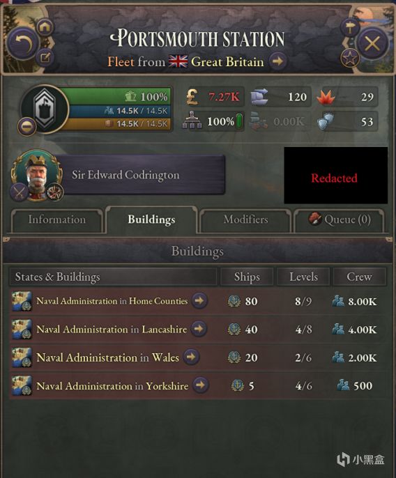 海軍部與海軍基地的區別在於,海軍部建築等級並不與戰艦一一對應。海軍部每級擁有1000名海員,可以以100名海員爲單位分配給任意船艦。而對於我們這艘巨大的、需要1500名海員的克勞狄烏斯號而言,它會佔用等同於1.5級海軍部的海員。當然,這樣的改動後,你將需要自己建造海軍部,以便你爲你的艦隊準備一些預備海員,避免倉促上陣。
