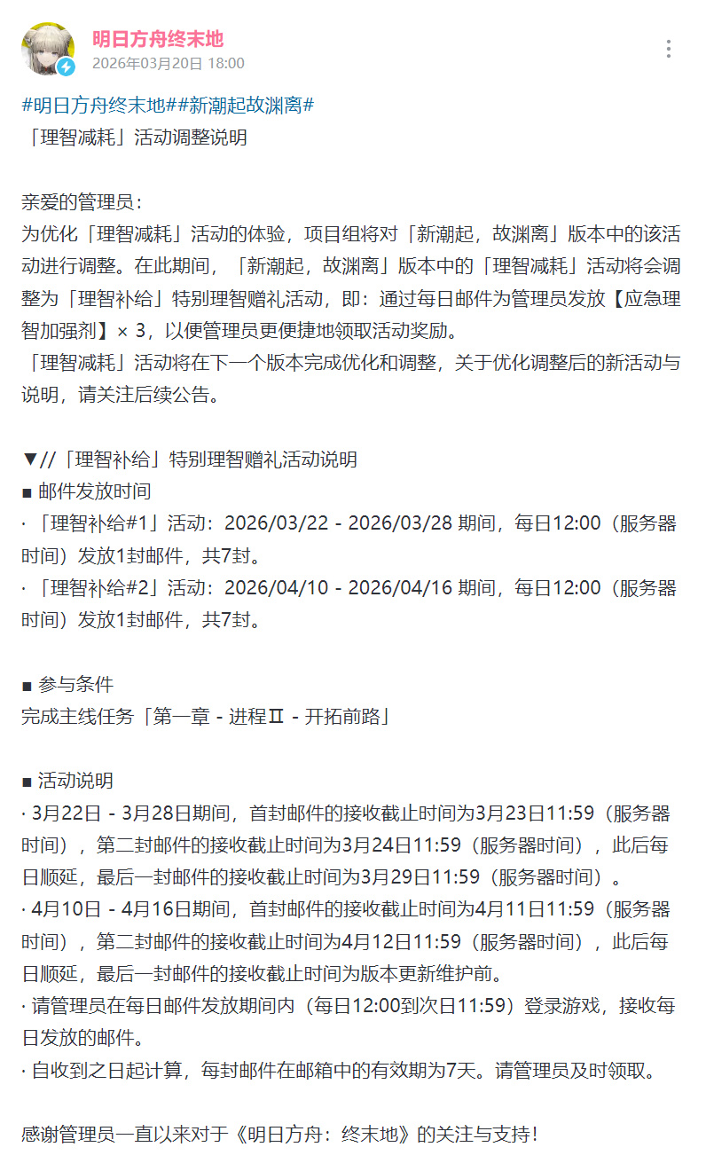 製作組將通過每日郵件爲玩家發放【應急理智加強劑】× 3。