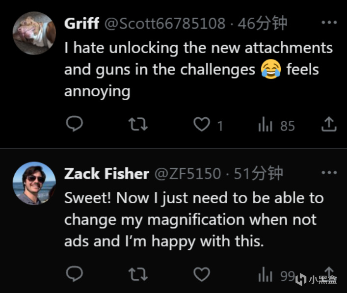 當然面對這一發現,外網老哥們也表達了不同的態度。Griff表示不喜歡通過挑戰解鎖新配件和槍支,感覺有些讓人煩躁;而Zack Fisher則非常開心,對於能夠調整放大倍率很滿意。