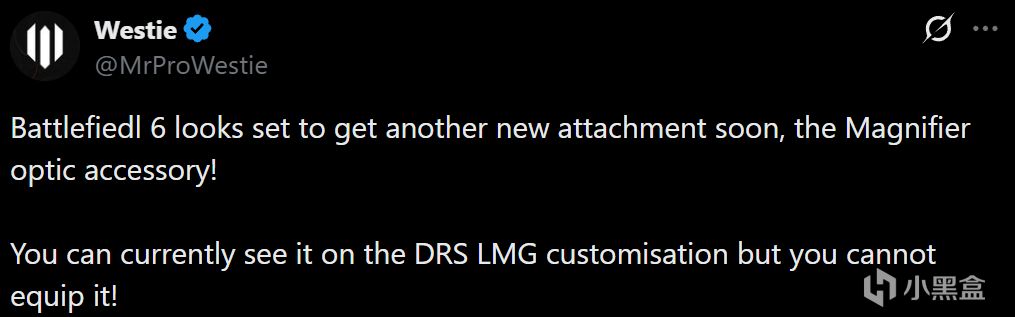 根據外網老哥Westie近日發現,《戰地6》似乎即將迎來另一款全新配件-放大鏡瞄準器!目前遊戲中我們可以在DRS輕機槍的自定義選項中看到它,但目前還無法裝備。