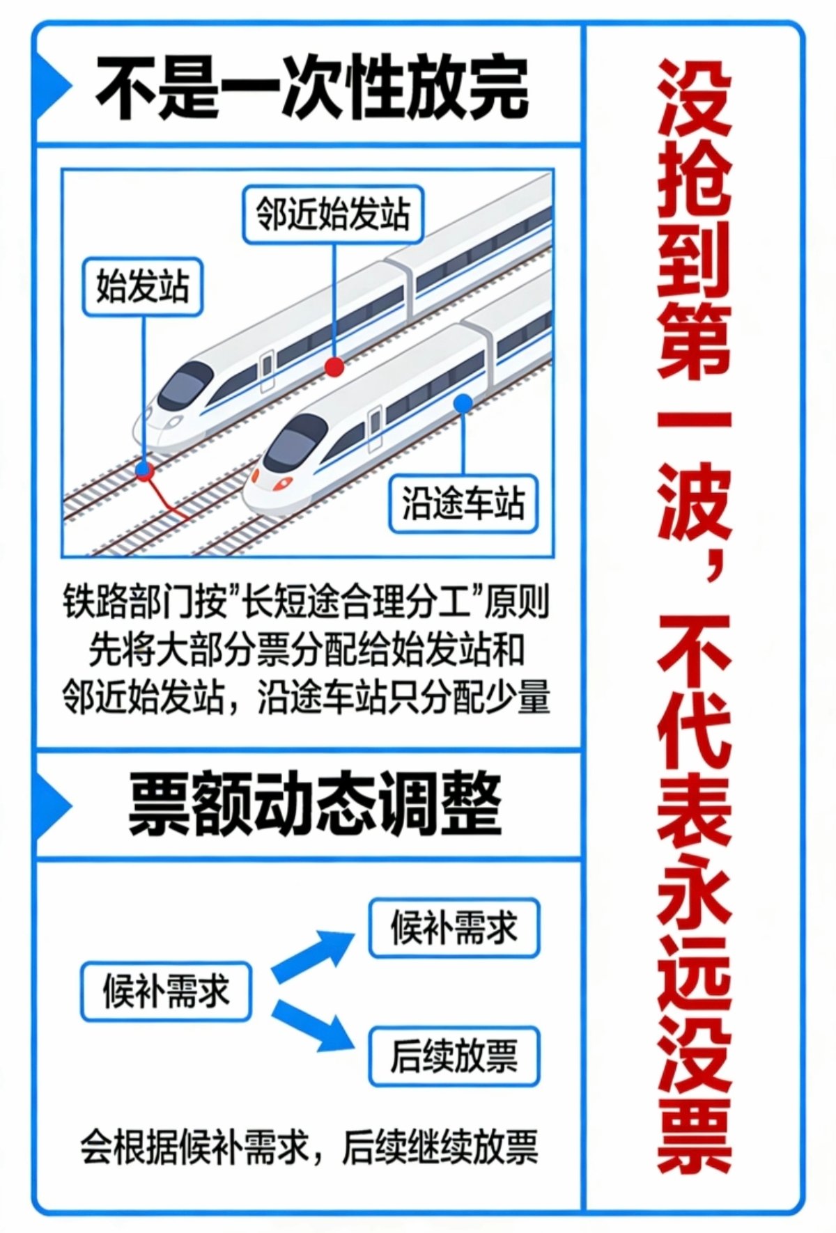其实不是。 铁路部门会按“长短途合理分工”的原则,先把大部分票分配给始发站和邻近始发站,沿途车站只分配少量。而且,票额是动态调整的——会根据候补需求,后续继续放票。
