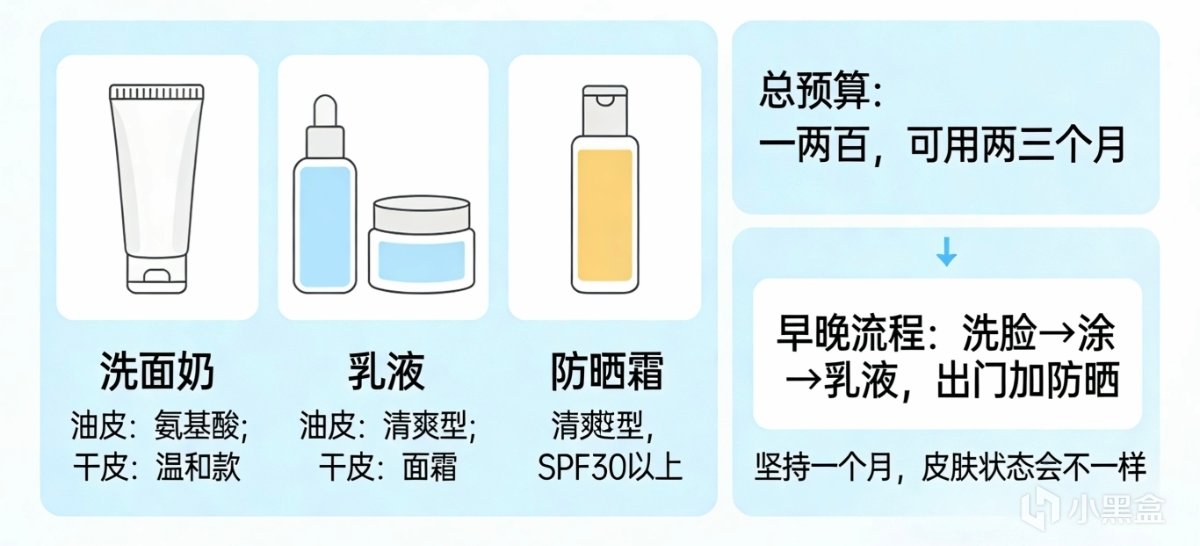 總預算一兩百,能用兩三個月。早晚各一次:洗臉→塗乳液,出門加防曬。先堅持一個月,皮膚狀態會不一樣。