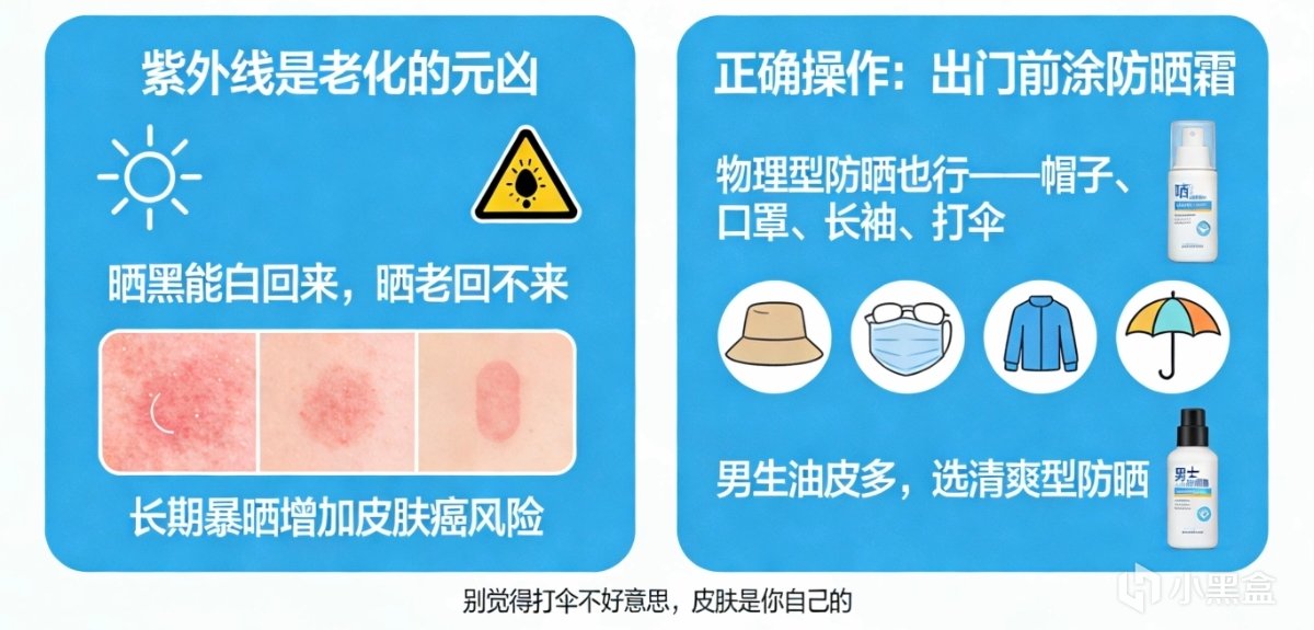 紫外線是老化的元兇。曬黑能白回來,曬老回不來。而且長期暴曬還會增加皮膚癌風險。那些看着比同齡人年輕的,多半是從年輕時就開始防曬了。