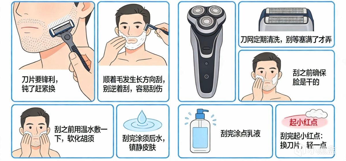 刀片刮鬍子:刀片要鋒利。順着毛髮生長方向刮,別逆着刮,容易刮傷。刮之前用溫水敷一下,軟化鬍鬚。刮完塗鬚後水,鎮靜皮膚。