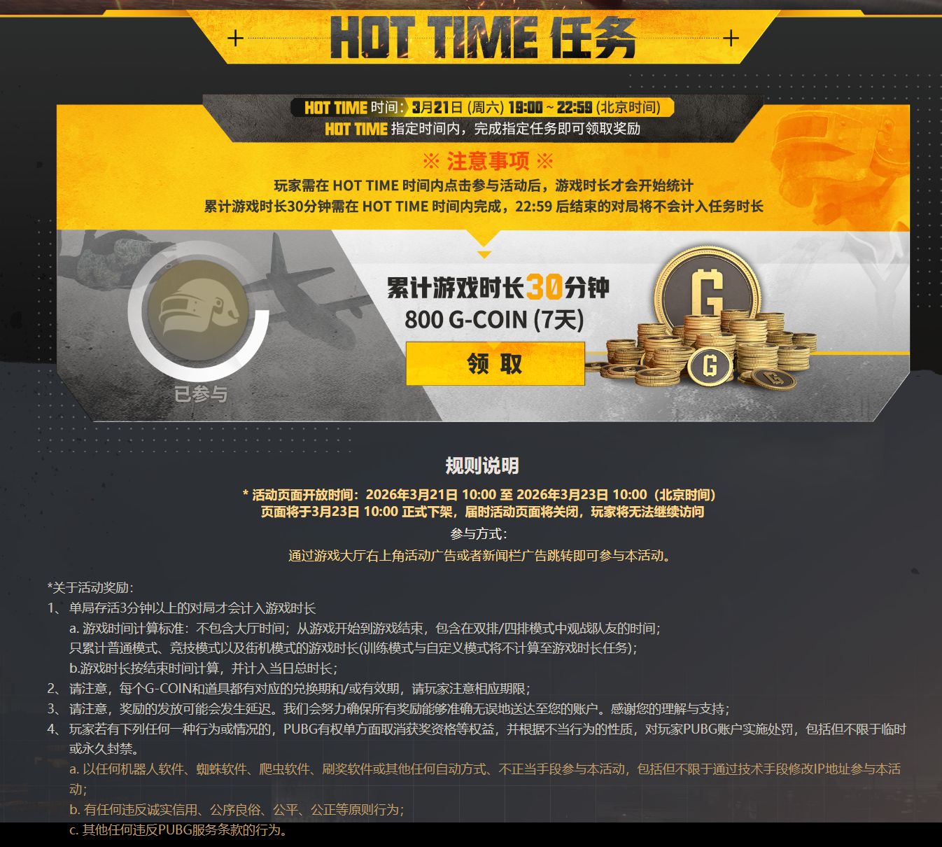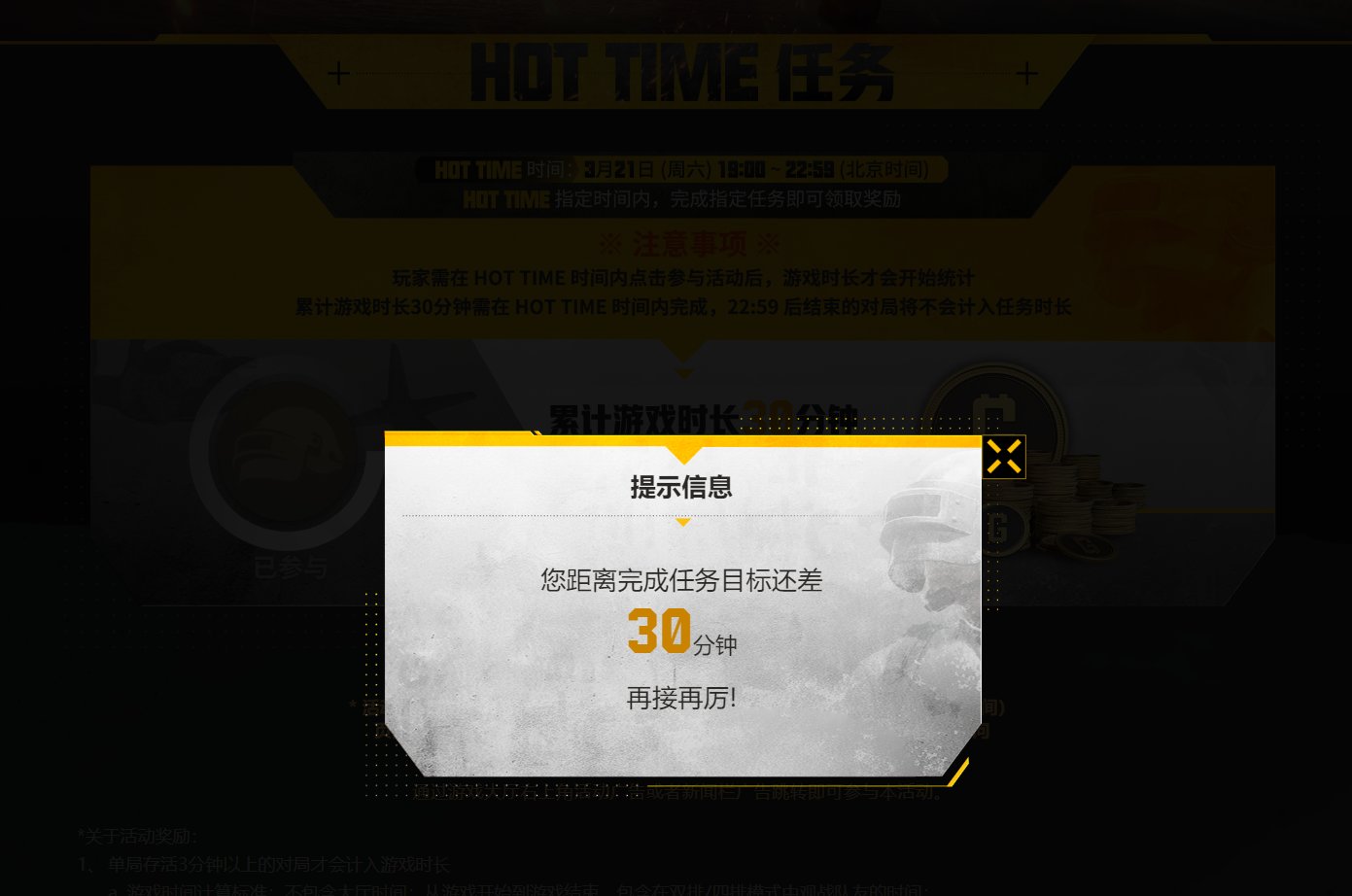 喫雞玩家應該都知道,這次週年慶活動在2026年3月21日晚上17時登錄可以直接領取300G幣,但是還有800G幣需要在19時到23時遊戲30分鐘以上才能領取,並且之後遊玩的時間並不會計算!
