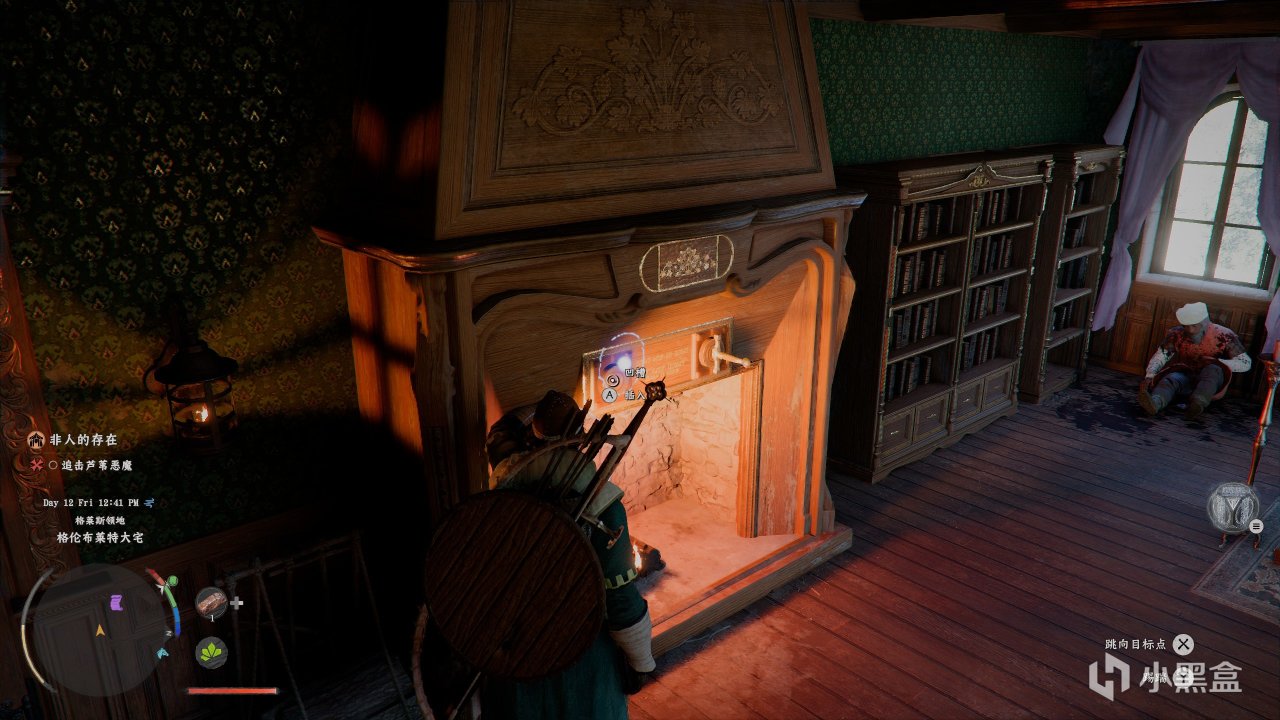 取得所有宅子關鍵道具之後,在二樓僕人那間房間裏,可以打開機關,如圖插上兩把劍,右邊書架會移動出現通道,進去是個去地下室的樓梯