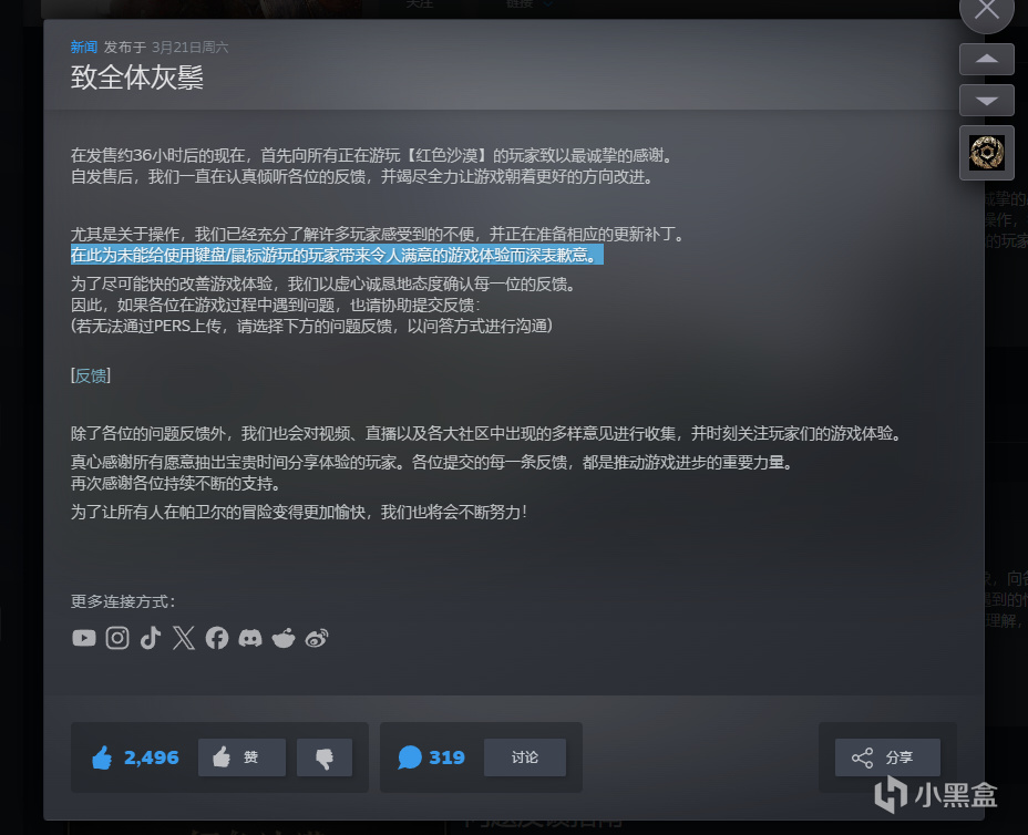 游戏发售约36小时后,官方发布公告,对已经进入游戏的玩家表达感谢,同时说明团队一直在关注反馈,希望尽快优化体验。