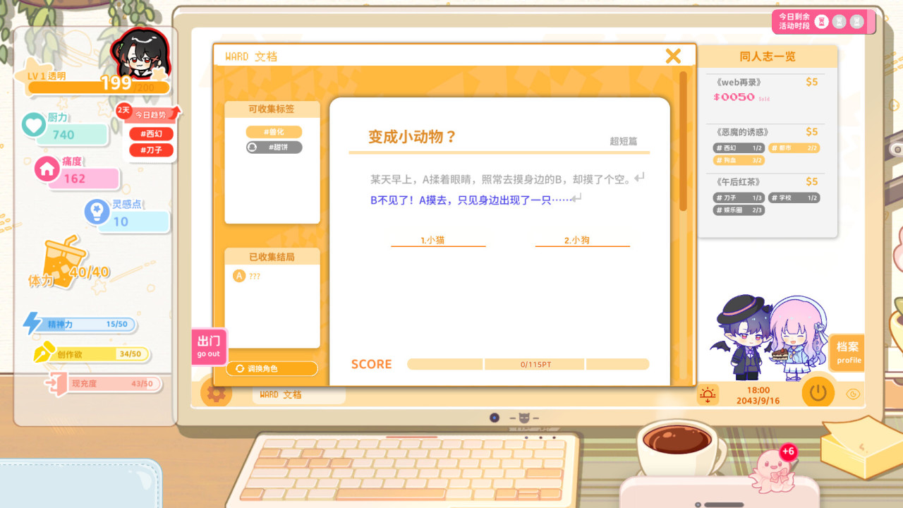 《太太!我喜欢你!》是一款同人女模拟经营游戏。你将会扮演一名同人爱好者,为你热爱的CP创作。你可以在商店购买或自制谷子,摆阵、扎包、布置你的海景房。还能创作同人小说、出同人本参加漫展,积累粉丝、成为大手;和四位性格迥异的同担一起,开始属于你的同人圈故事吧!
