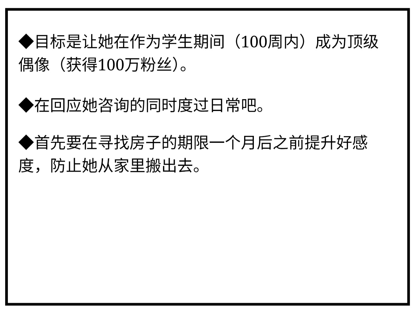 100周之內成爲100萬粉絲的頂流偶像,不然遊戲就會失敗,觸發壞結局。