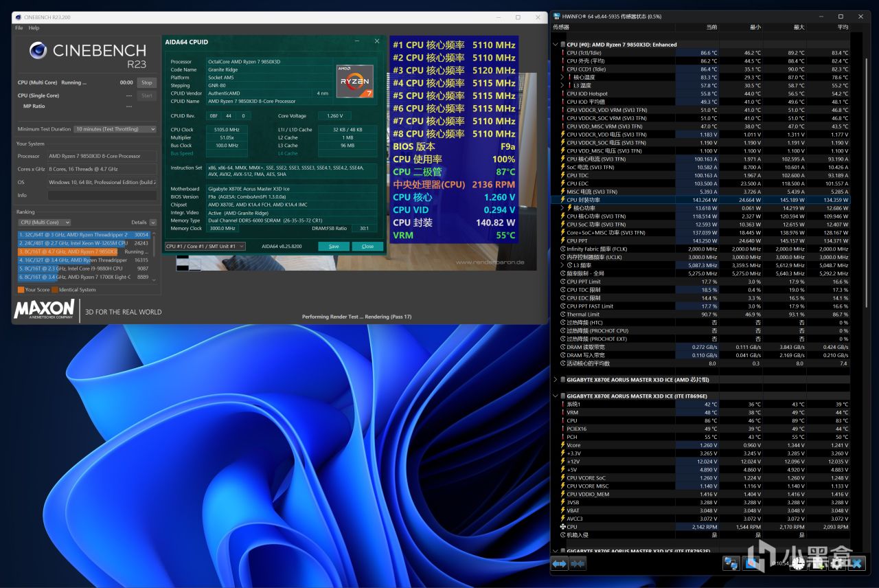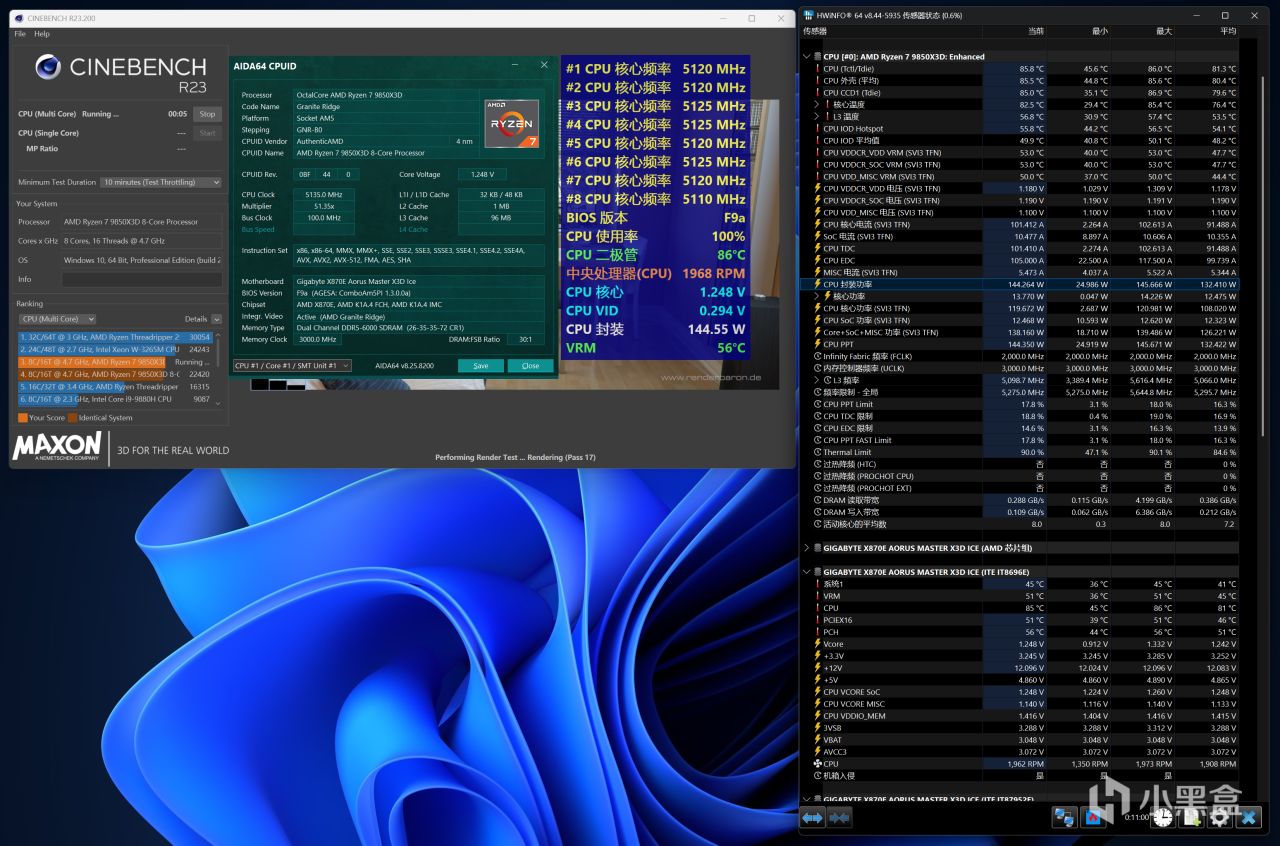 CINBENCH R23多核循環項目十分鐘,9850X3D頻率穩定5.10GHz左右,CPU外殼平均溫度爲82.8℃,距散熱器4CM處使用分貝儀測得滿載噪聲約爲58.1dBA。