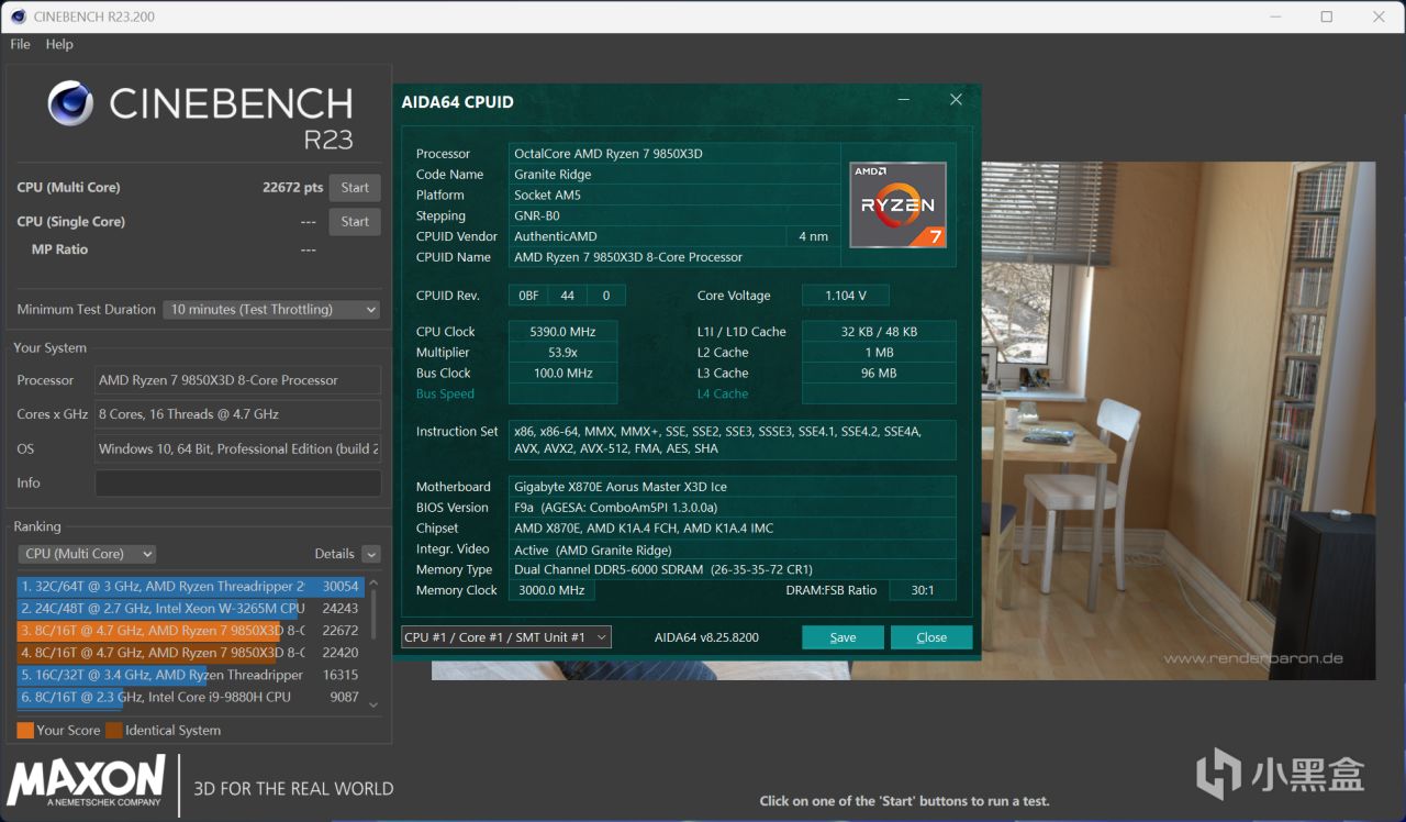 CINBENCH R23多核循環項目十分鐘後,9850X3D分數爲22672 pts