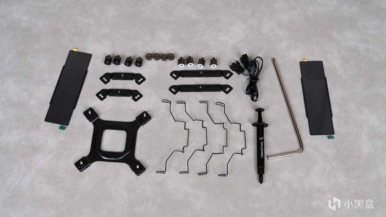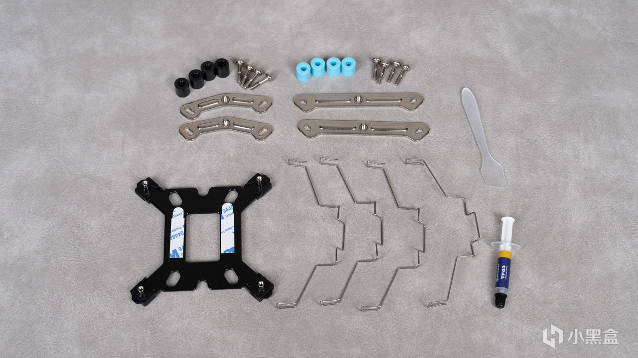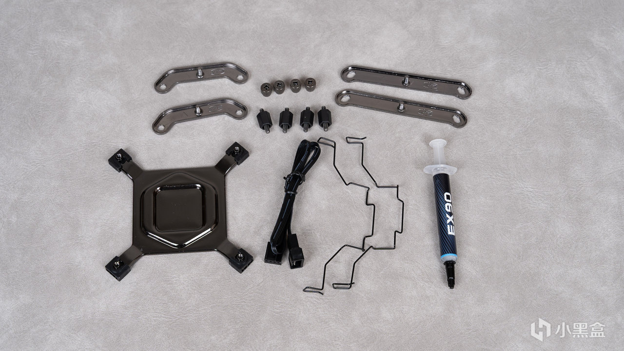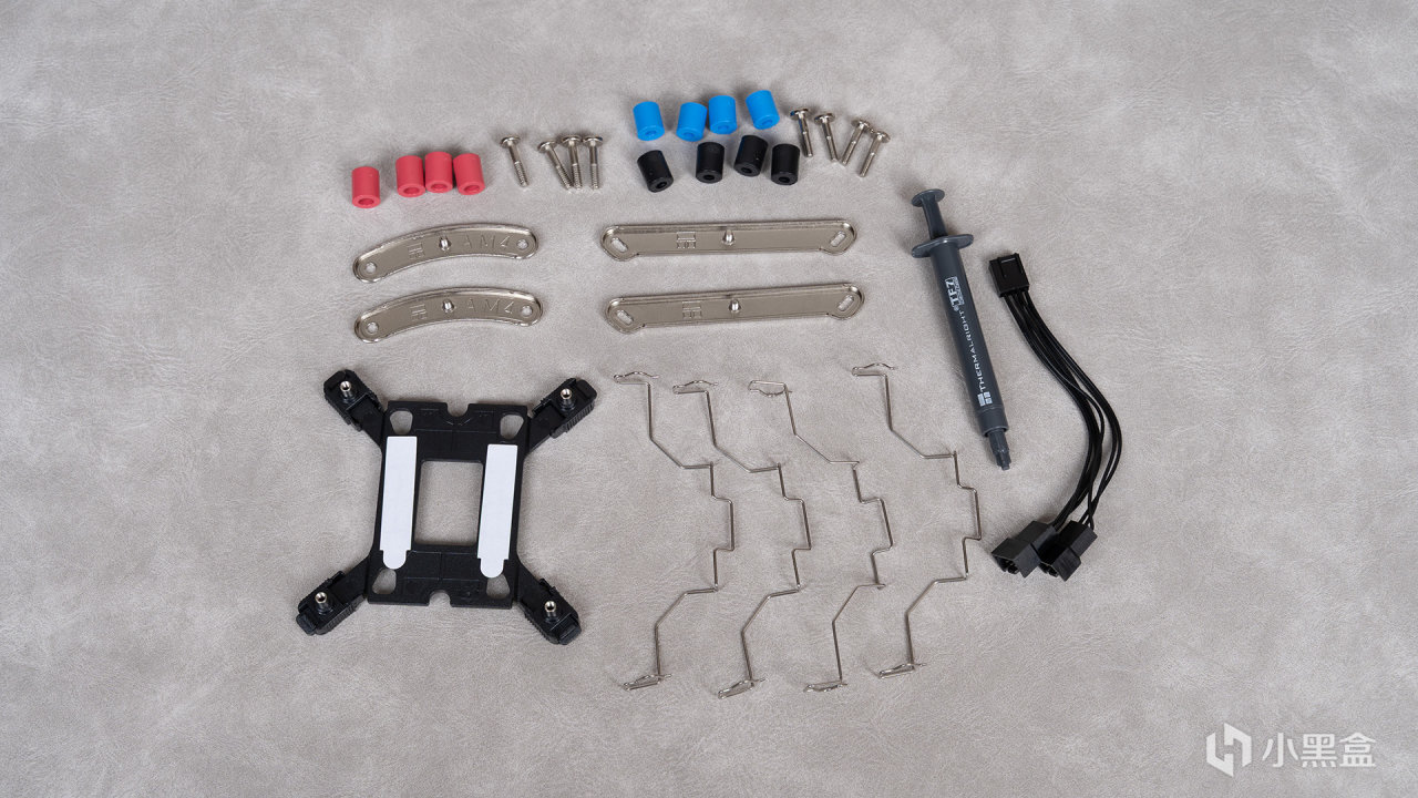 九州風神AK620 G2暗夜配備全黑化主流Intel和AMD平臺扣具,兩套平臺除了螺帽以外都是區分使用。除此之外,九州風神還提供了黑色矩陣風格貼紙、簡易十字螺絲刀、風扇4pin供電Y線和硅脂這些豐富配件,不過硅脂未標註導熱係數。